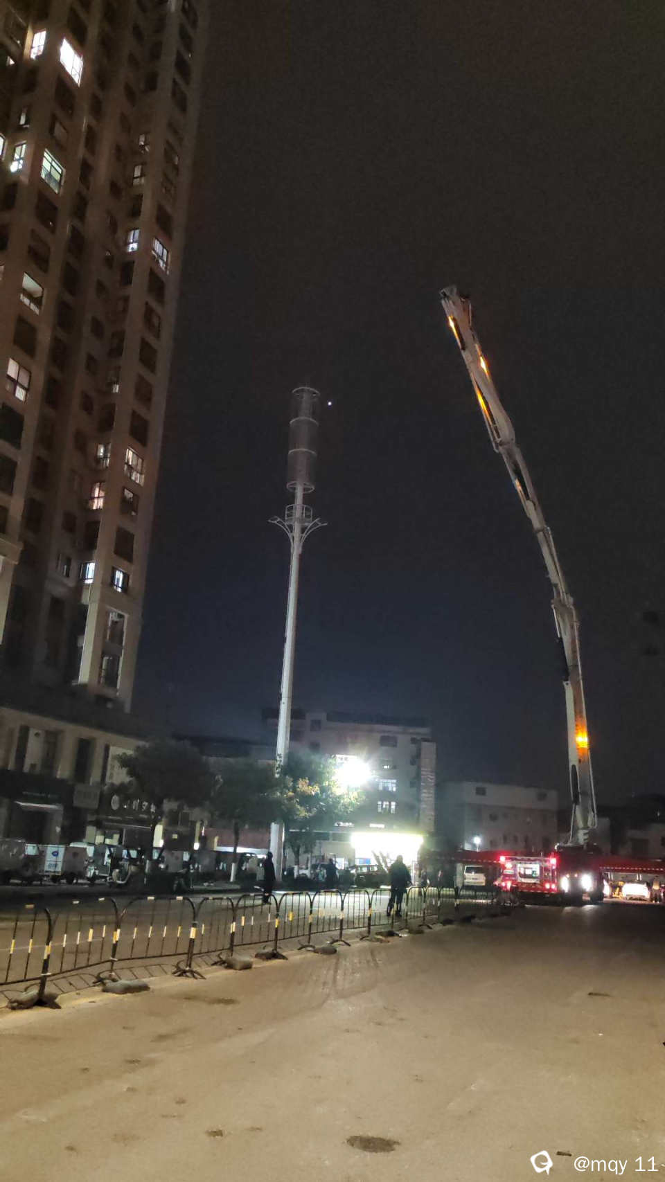 12月11日晚上八点多,在桂林临桂新龙路,一台大大的设备,正在发出作业的声音,同时伴随着闪闪发光的灯光,伸出了长长的手臂,在高楼旁的夜幕下作业。