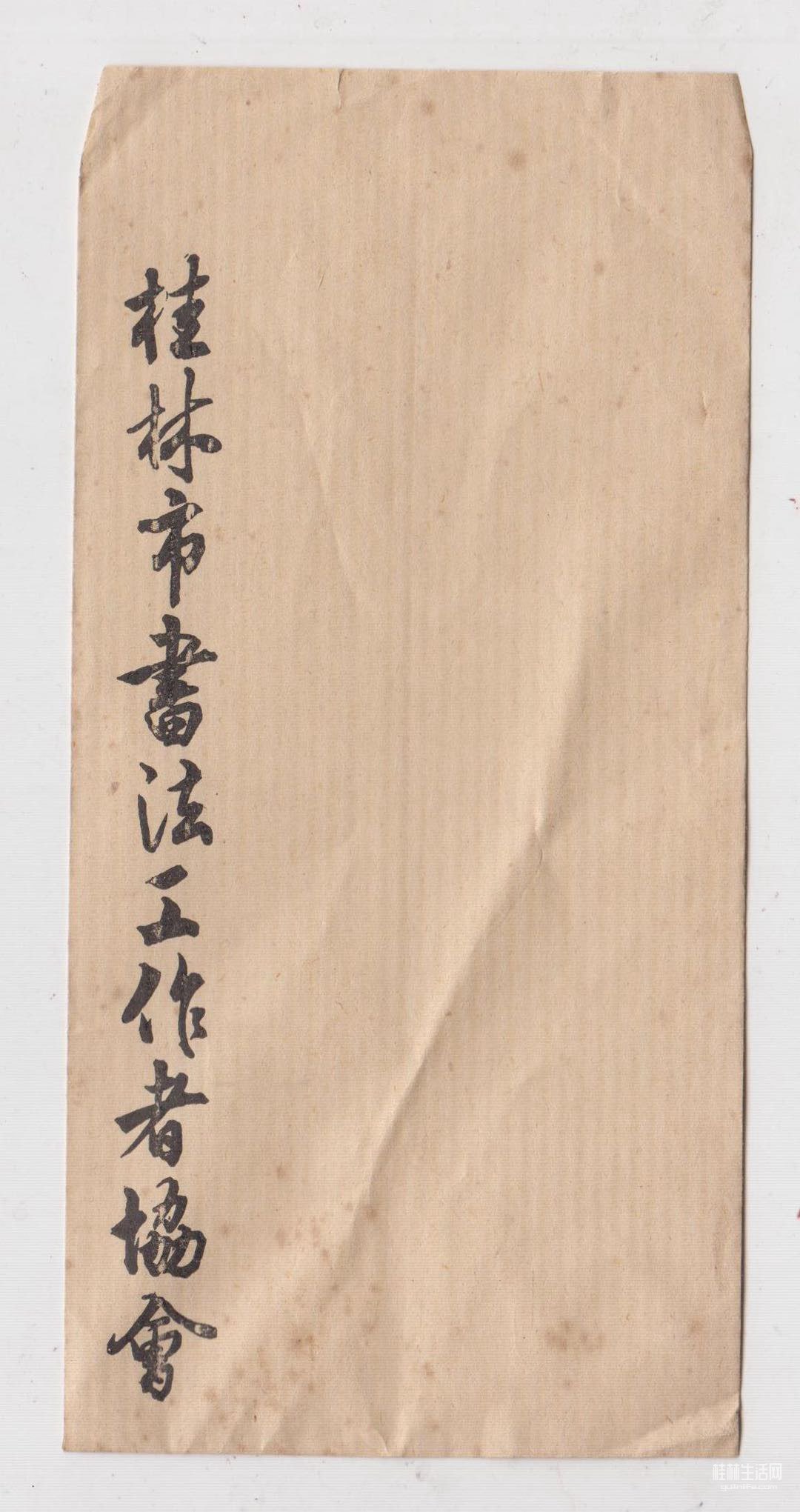 最早用于寄发通知的信封。字迹为60年代的桂林领导题写。书法一行对于我们这一辈人来讲,已经落伍了。我深深的理解这点,但我还在继续学习(我这种学习不是为了追求参展、获奖,而是练拳脚,不被人诟病冷言。中国书协资深会员,近75岁的人,东西拿出来展示不至于人家不相信,起码还过得眼,微微点头认可:不是“老干体”)我还在习帖写草书,也兼写各种字帖。博学、多练没有坏处。(食物多样性有利健康、卤水香料多种奇特出味,中草药杂把股东可治病康复。融会贯通拿捏自如,这是我借用的理论。字体习多识广,随机应变写得出,对付各种场合;练字抄唐宋诗词,积累文学涵养,应用到作文叙事中;把握各种粗细、大小、轻重、软硬、叉顺的毛笔,有数于心里头,运转于手掌中。)变换着姿势,地上书。(视野宽阔,如意把握布局。这是学过素描写生的姿势运用。)我没有那么多闲钱买宣纸就用旧报纸(三张直条粘成2.4米长)练习,桌面上就用大笔练榜书,(多支大笔已经开叉、废了,还在就着它用,目的是研究一下方位角度让它出意外效果。)墨是10公斤再15公斤的桶装买。已经练过卖废旧报纸千余斤了(不是吹牛,有照片斤两留存)(有人讲,我们已经被书协的展览边缘化了。没错,是事实。我要是再不努力,一样被拿下,那还要脸忸哦。哪喊你几十年写的字总是那个样子,陈陈相因,没有变化,更无创新。其实我也在认真思考。跟时风我们跟不来了,这弯太急转不过来。确实我们要把书法和毛笔字分开认识。我坦诚,自己还停留在写毛笔字的水平上,个个认得、人人认可。要是写点你们认不得的那才是书法。而求我写字多数人还是要我的毛笔字。人家不认可我的书法。为了有点小利,添补家用,那只好看人心里,客随主便。)