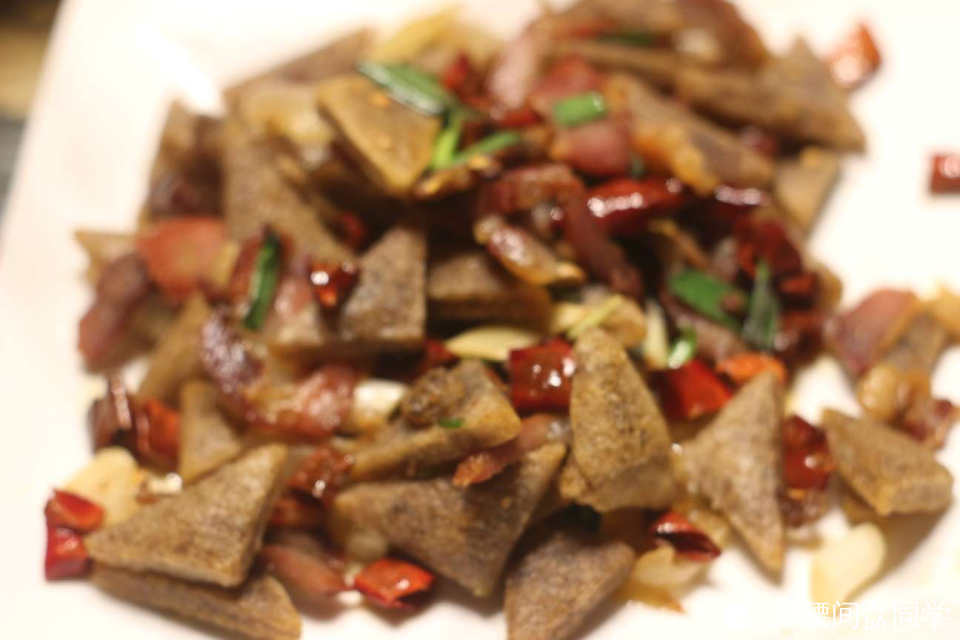 蕨粑腊肉,蕨粑切成一块一块的小三角形,腊肉一片一片也是咸香爽辣,好吃嚼得动~