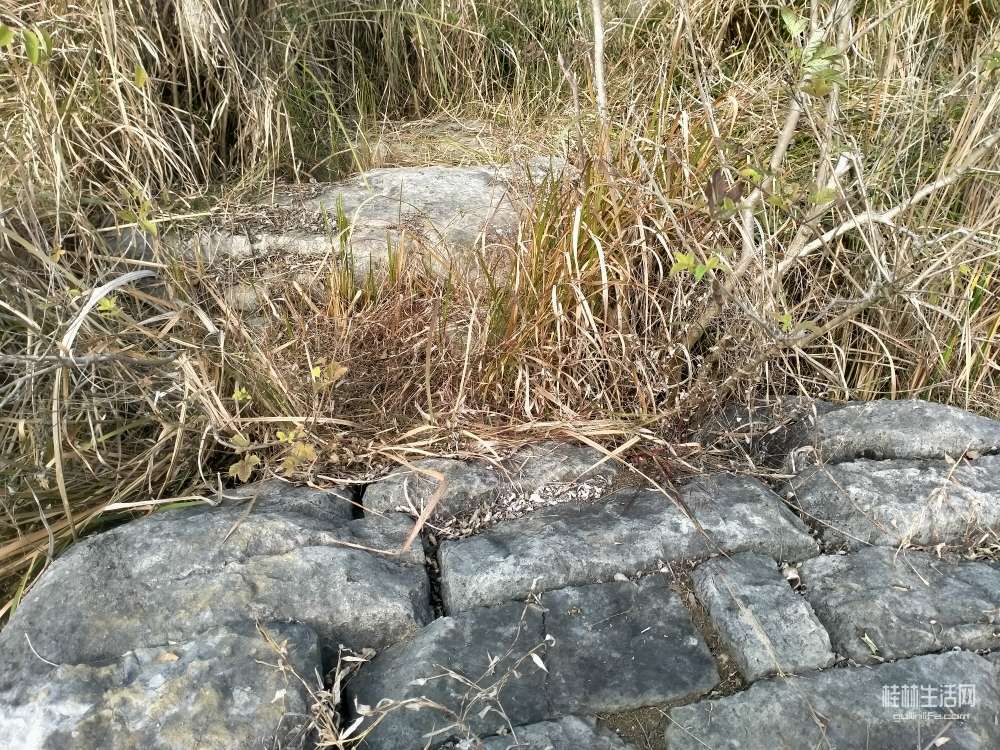 过石拱桥再走几十米茅草地,就看得到附近居民的菜地,石板路在这里消失。