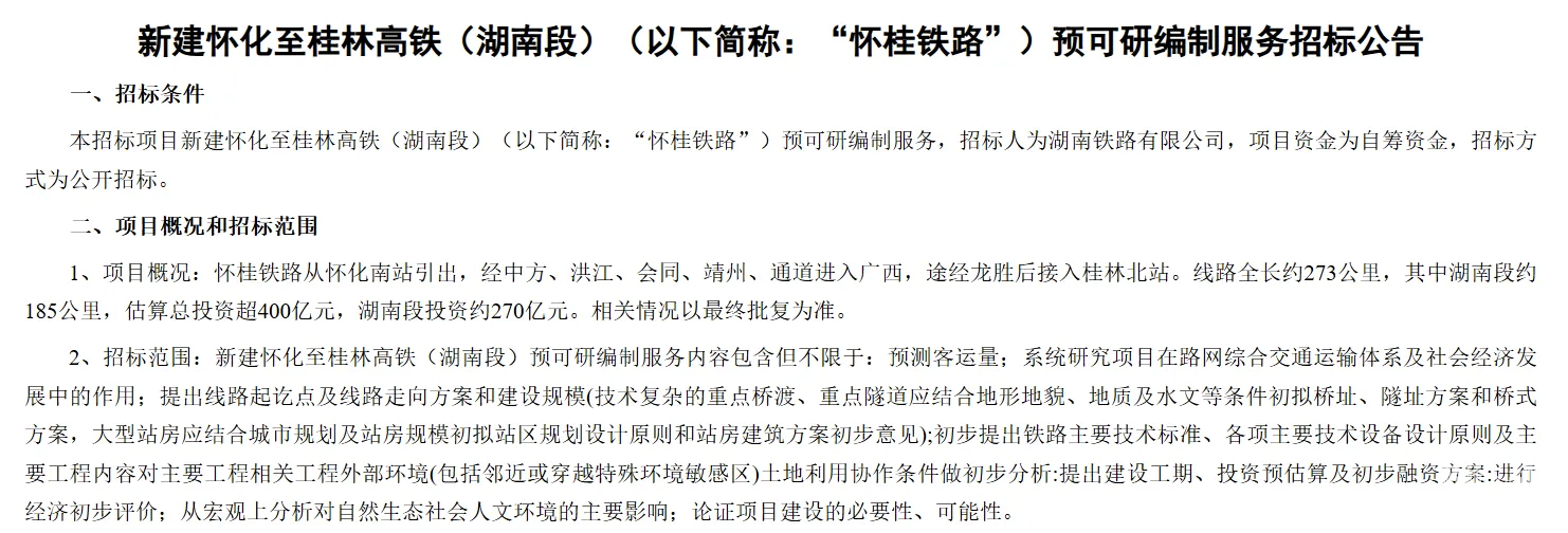 怀桂高铁力争在“十五五”期间(2026-2030年)开工建设。从整体来看,湖南段“动静”相对较大。今年3月,全国“两会”期间,湖南代表团以代表团名义提交了《关于支持加快推进湖南重大铁路项目规划建设的建议》,明确提出将怀化至桂林高铁新增纳入国家“十五五”铁路发展规划,并尽早启动前期工作;今年8月底,项目纳入湖南省发改委印发的《2025年重大投资项目前期工作经费拟支持项目清单》,获得项目经费支持。
