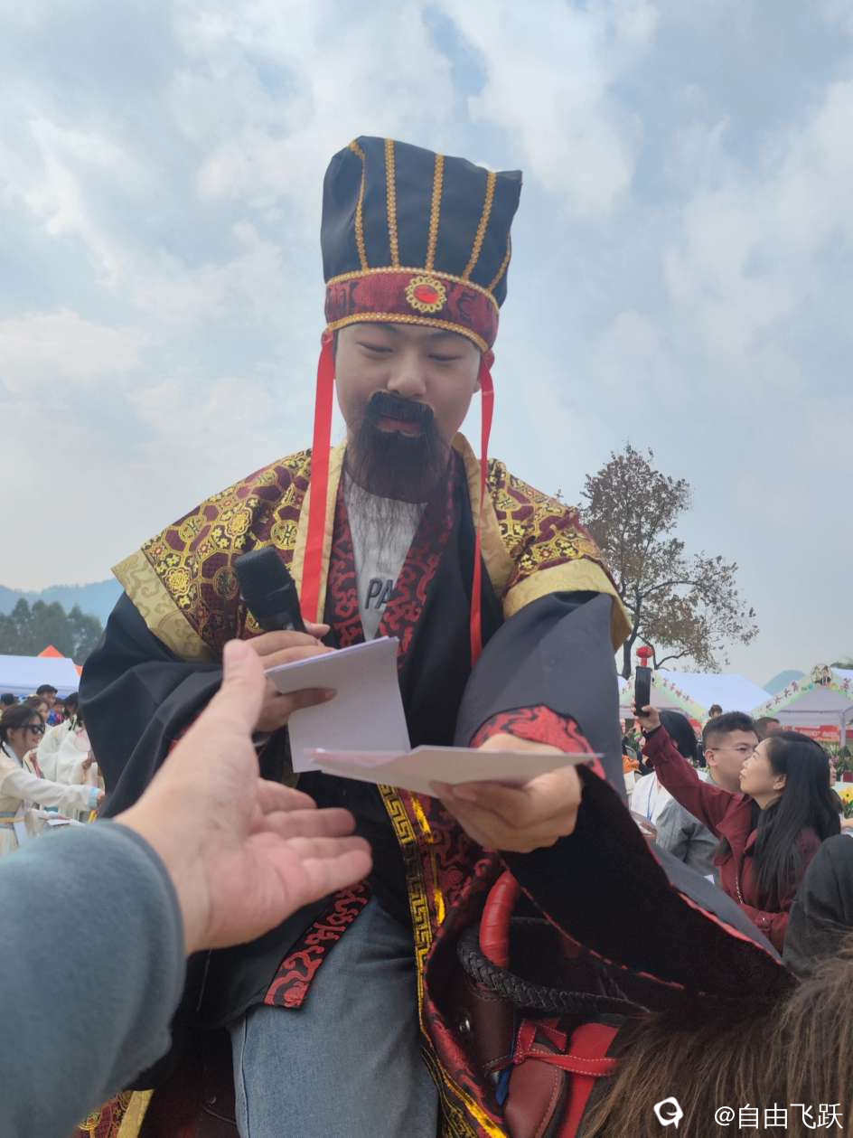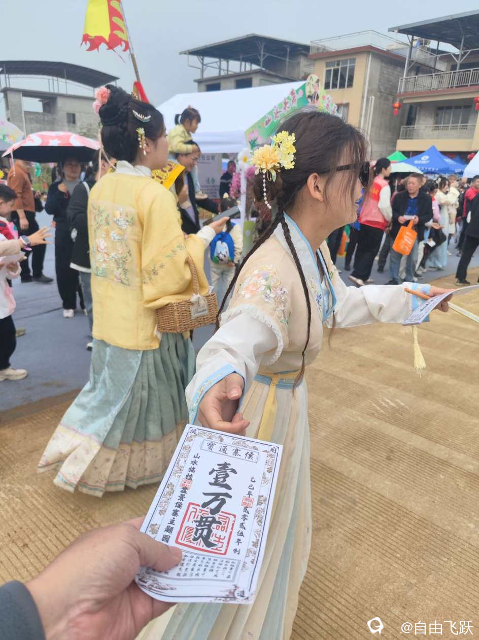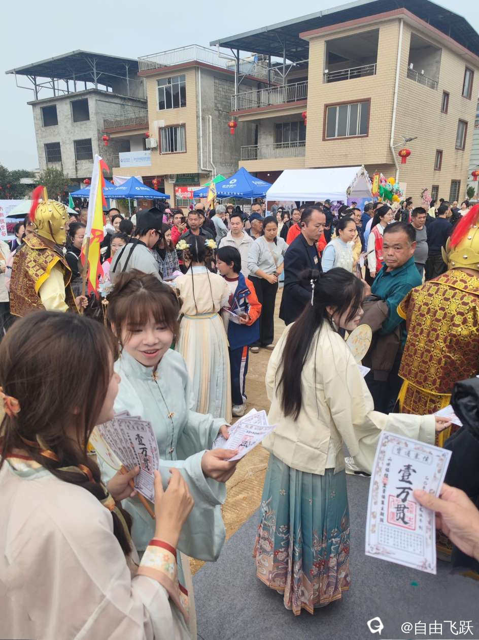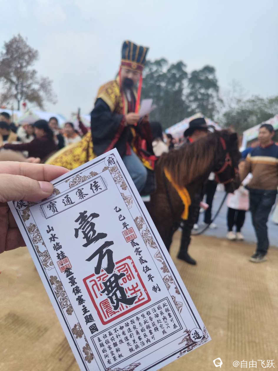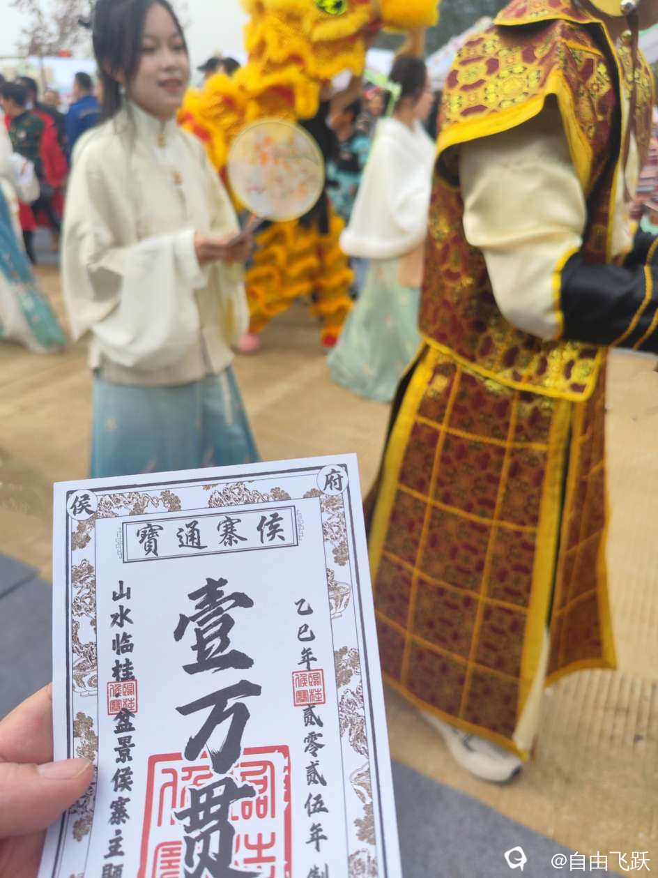 到达侯寨的时候,看见进村路上车水马龙,人流汹涌,颠覆了我原以为人迹寥寥的想法,并且正好赶上古装侯爷整队出巡,前头醒狮开路,中央黑胡须侯爷骑着骏马一路走一路发赏银,后头小姐丫环们相跟着也一路打赏银票,行人看客们边领赏边叩谢,其乐融融,原以为“银票”只是一张张纪念品,后来发现是可以用来兑换盆景或食物的“真金白银",后悔才领了两万贯,太少了,开始应该多伸手讨要,但是想起老师以往的责备:“做人不要太贪心,要适可而止”,也就释然了。