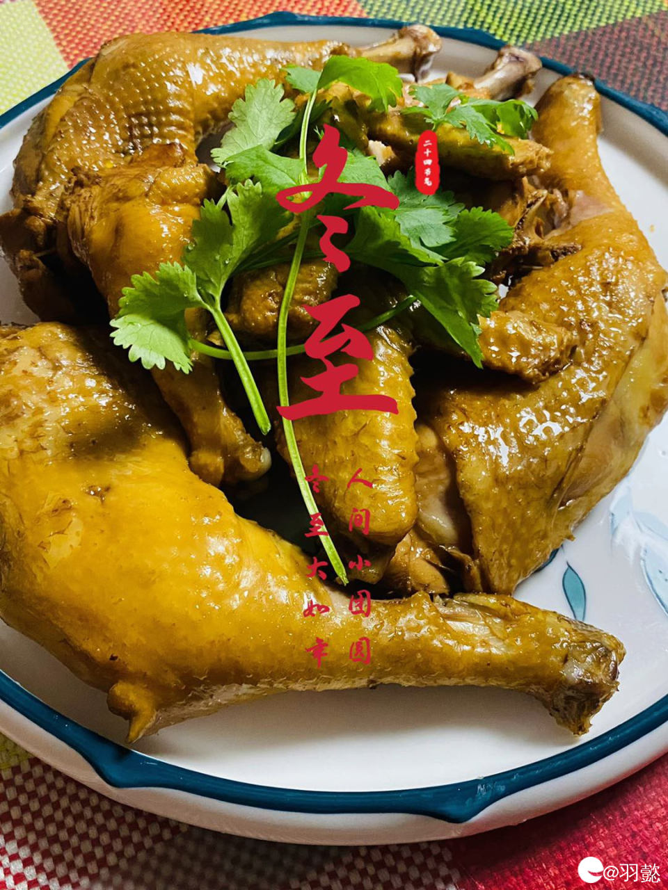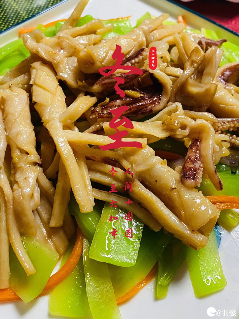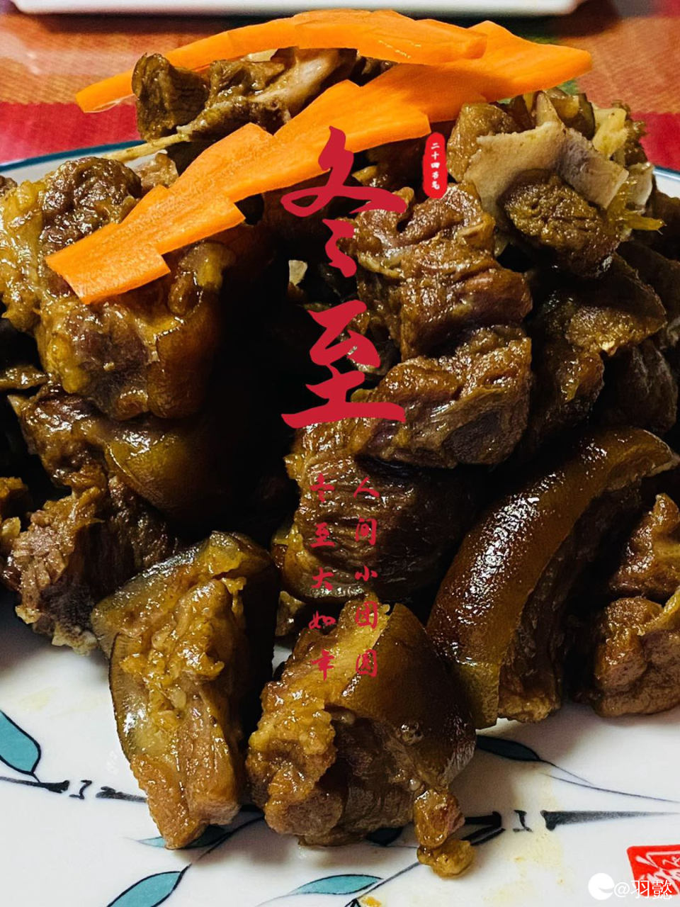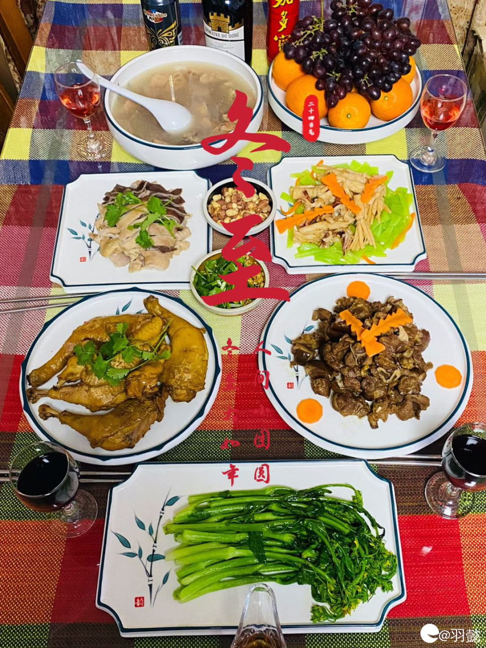 冬至的快乐,是炒鱿鱼的弹牙、卤鸡腿的入味、莲藕排骨汤的清甜,红烧地样鲜,清炒菜花,配上红酒