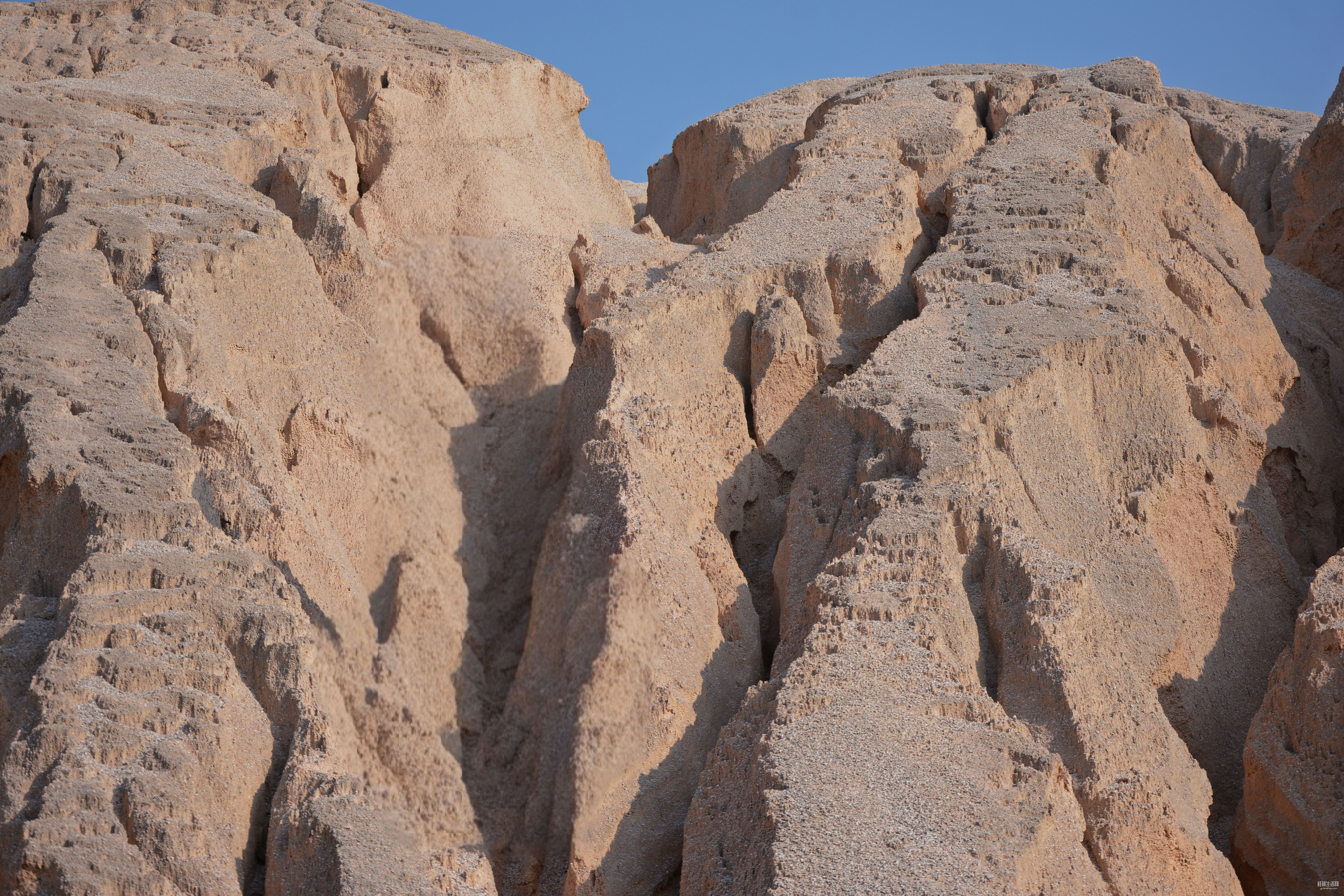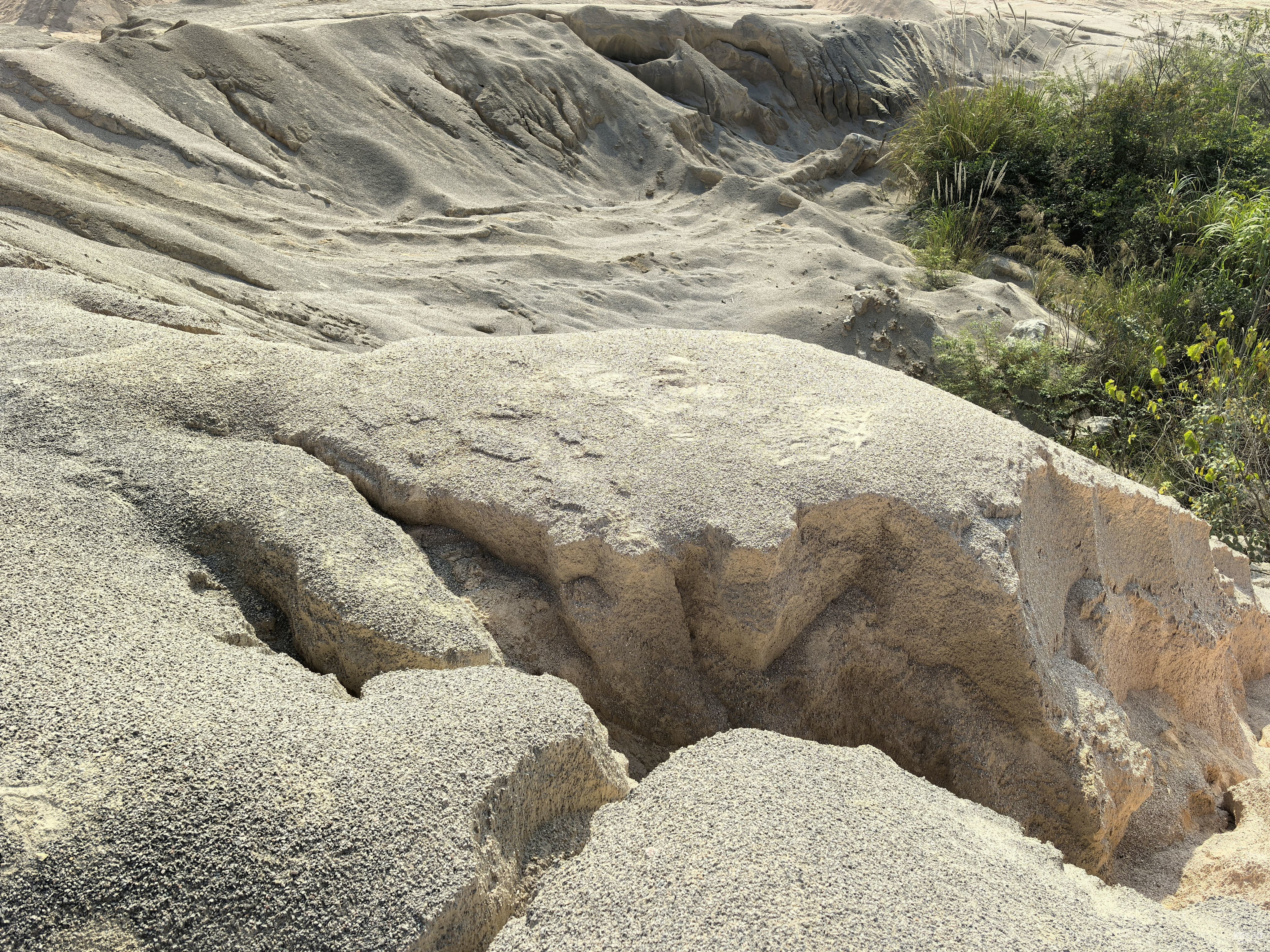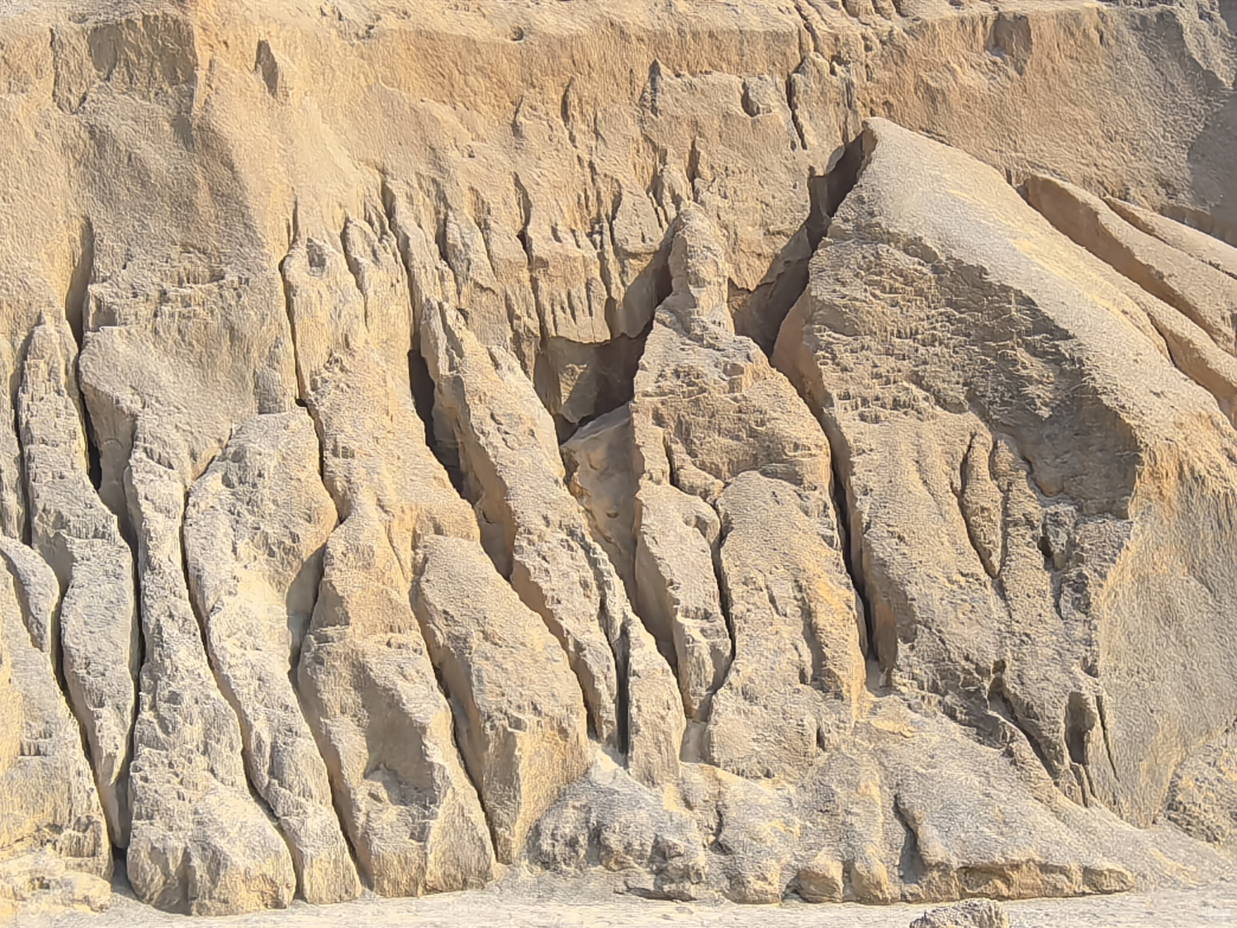 沙谷依偎在群山的臂弯里,谷坡上的沙粒由浅褐与黄色交织的颜色;谷壁上偶有耐旱的植物,贴着沙土倔强生长。那些深浅不一的沟壑,是经年累月雨水冲刷留下的蜿蜒印记,仿佛无声的诉说着岁月的雕琢。