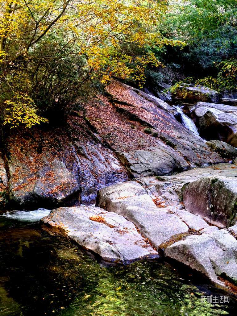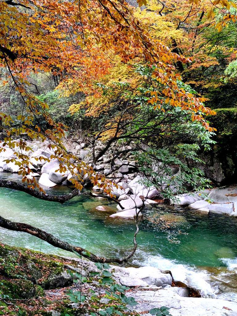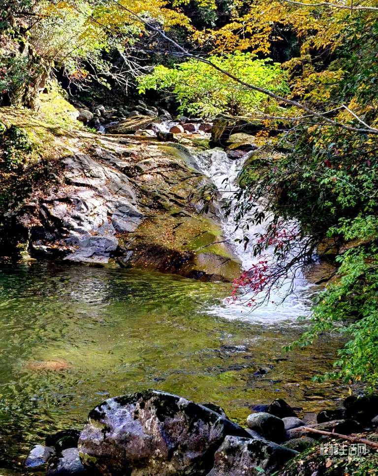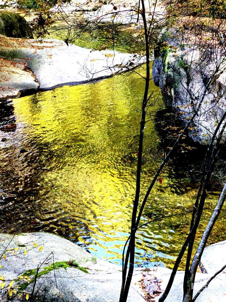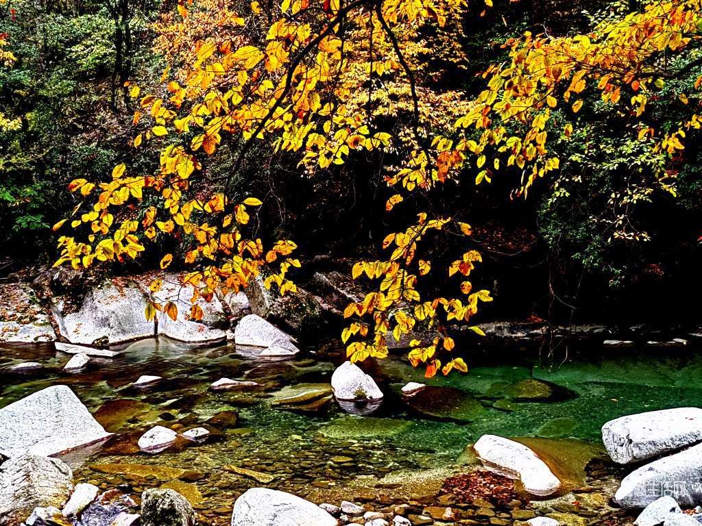 三个朋友搜攻略,按好拍摄的角度,决定去十八月潭,米仓山,有攻略说光雾山小雨有雾,且今年光雾山五仙峰顶红叶已落光,大家决定放弃,我们先到十八月潭,乘坐景区山腰,再沿溪水往下行,十八个潭就是十八个景,潭水清澈,或成潭,或成瀑,两岸枫树,青冈木已全黄,阳光透过黄叶映在翠绿的水面上,变成金黄,真的好美,那一刻我陶醉了,一路走走停停,用手机记录下那美丽的一刻