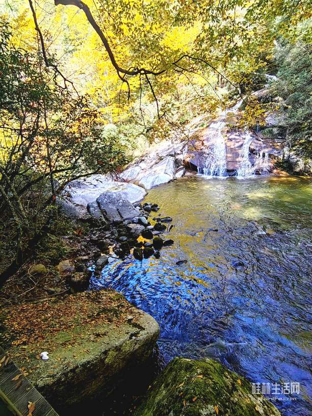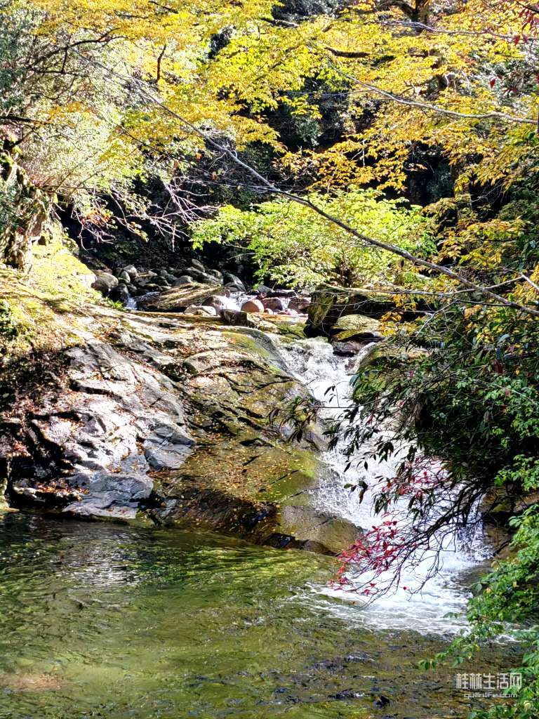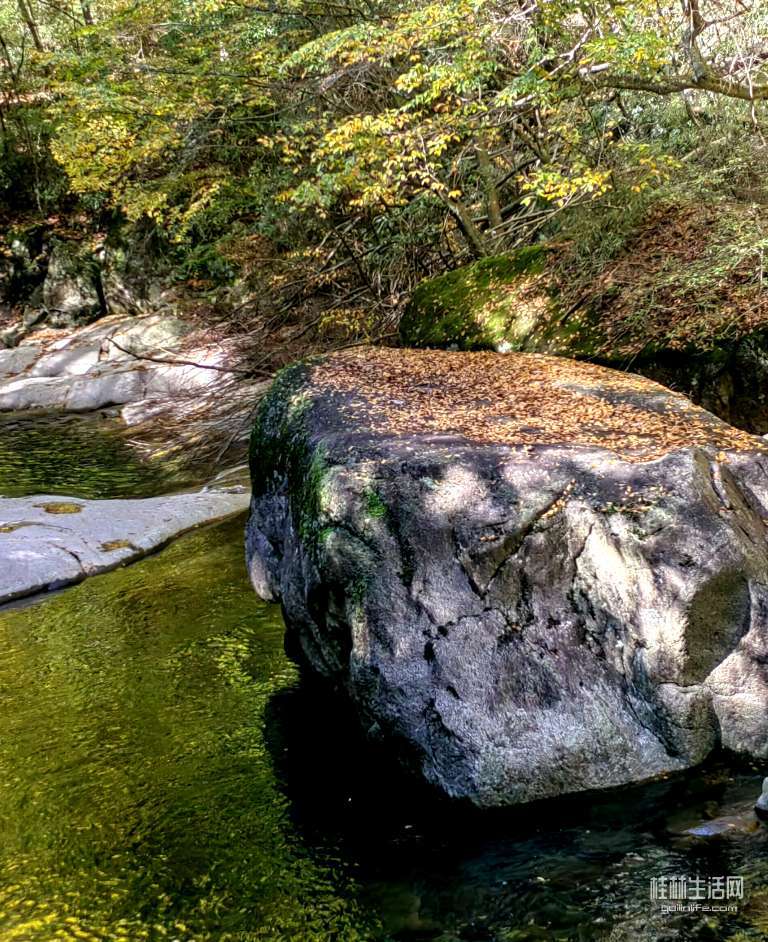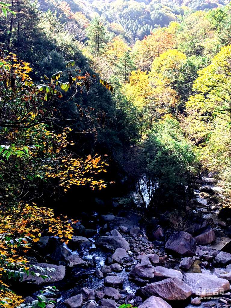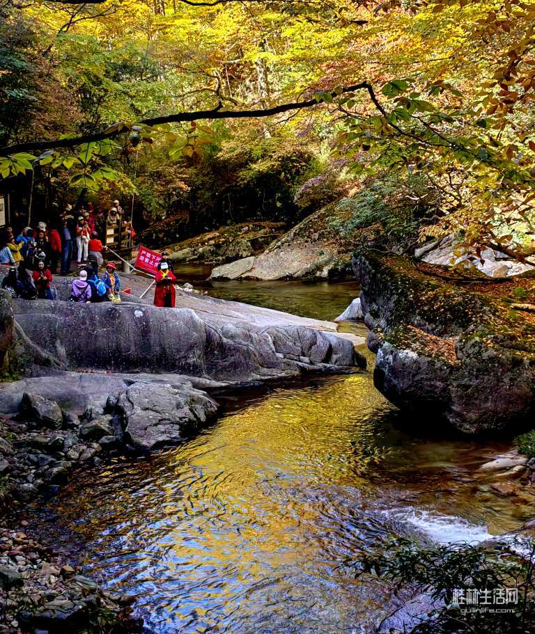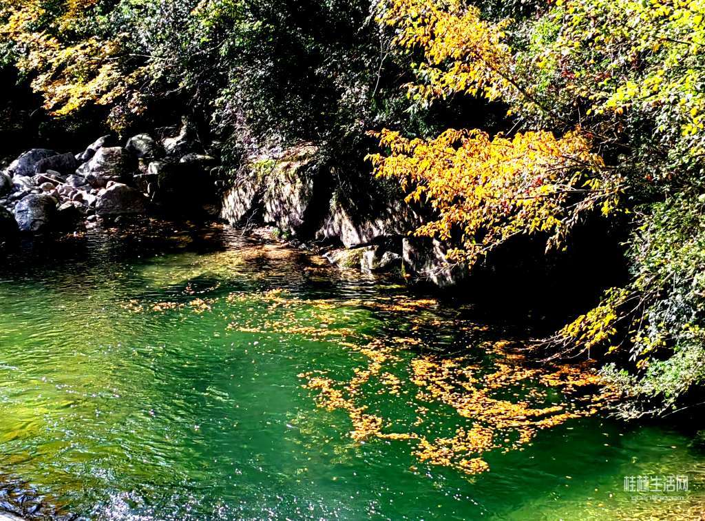 三个朋友搜攻略,按好拍摄的角度,决定去十八月潭,米仓山,有攻略说光雾山小雨有雾,且今年光雾山五仙峰顶红叶已落光,大家决定放弃,我们先到十八月潭,乘坐景区山腰,再沿溪水往下行,十八个潭就是十八个景,潭水清澈,或成潭,或成瀑,两岸枫树,青冈木已全黄,阳光透过黄叶映在翠绿的水面上,变成金黄,真的好美,那一刻我陶醉了,一路走走停停,用手机记录下那美丽的一刻