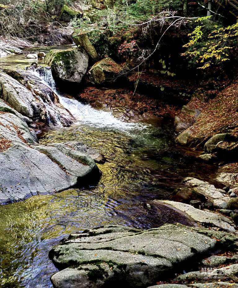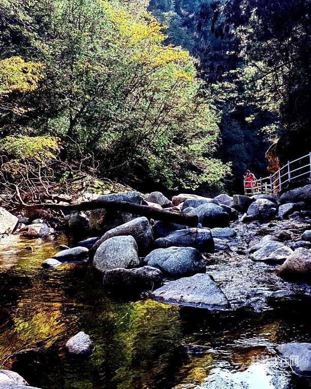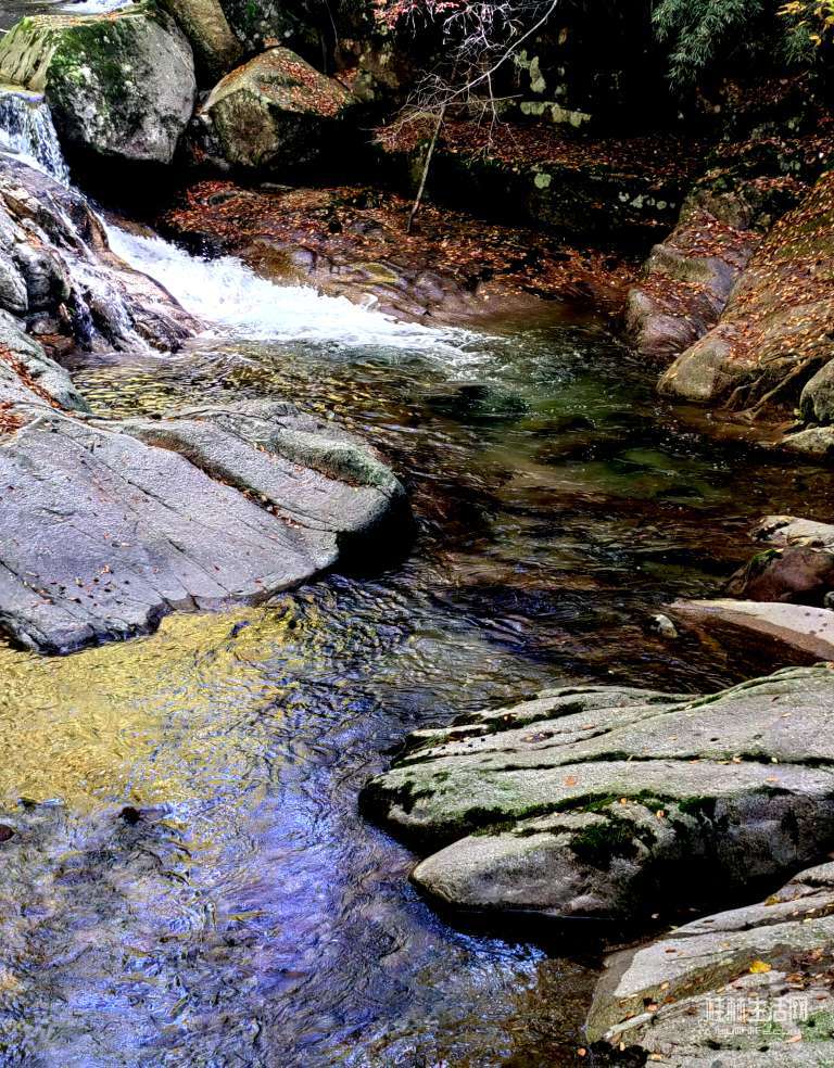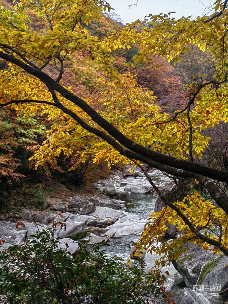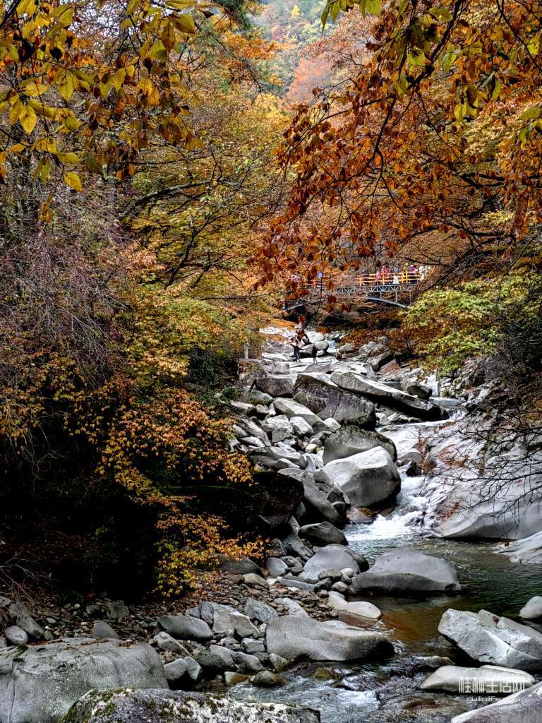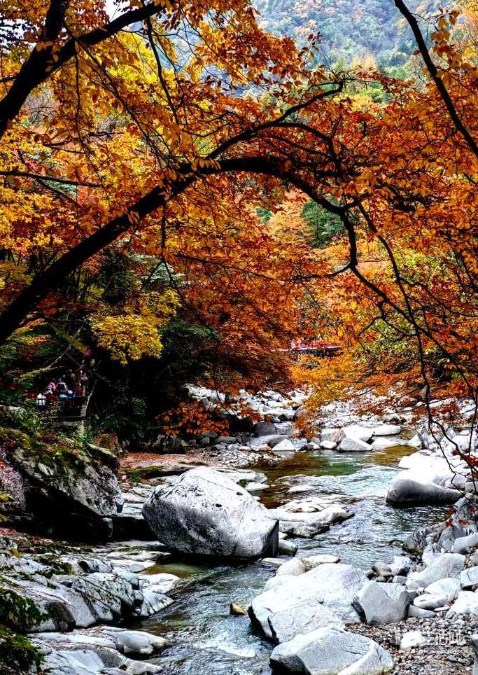 米仓山山峰连绵,山林中常有黑熊出没,公园里有座山的山形也恰似黑熊,山下那条溪水流淌的山沟,因此取名叫黑熊沟,十月的黑熊沟,溪水稍显干涸,溪中怪石嶙峋,一弘清水在红叶中蜿蜒曲行,红叶山石和清溪构成绝美的画面,宁静致远,着实让人难以忘怀。