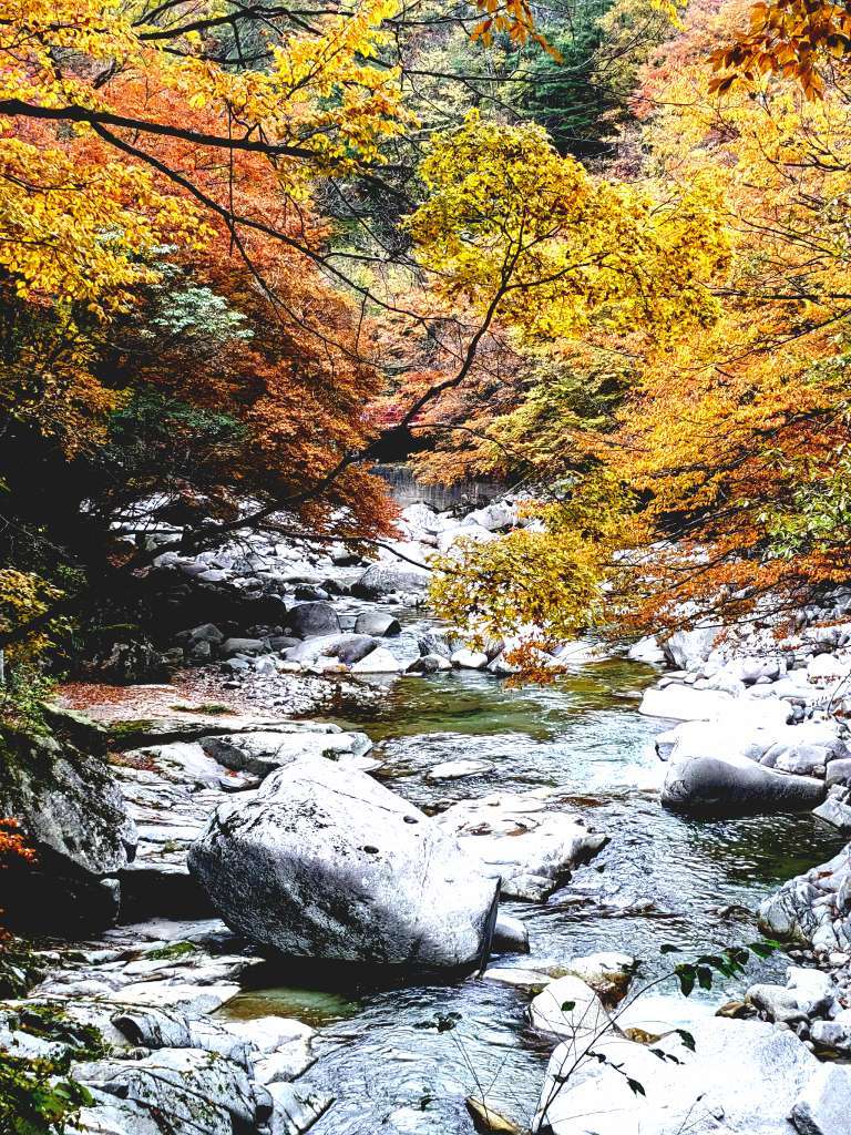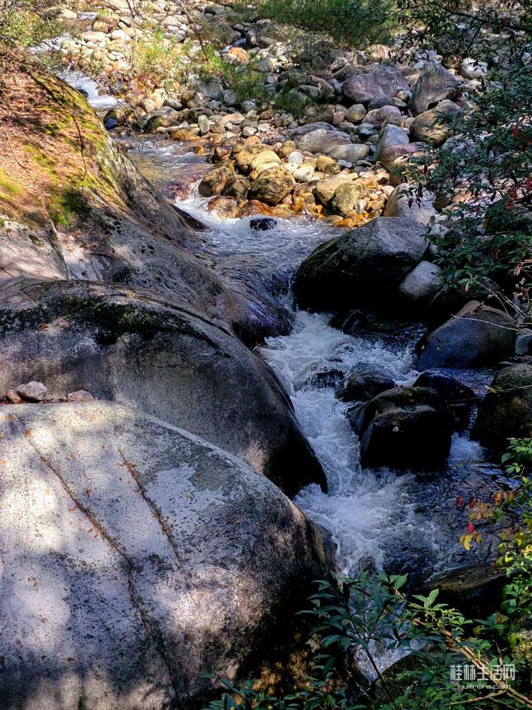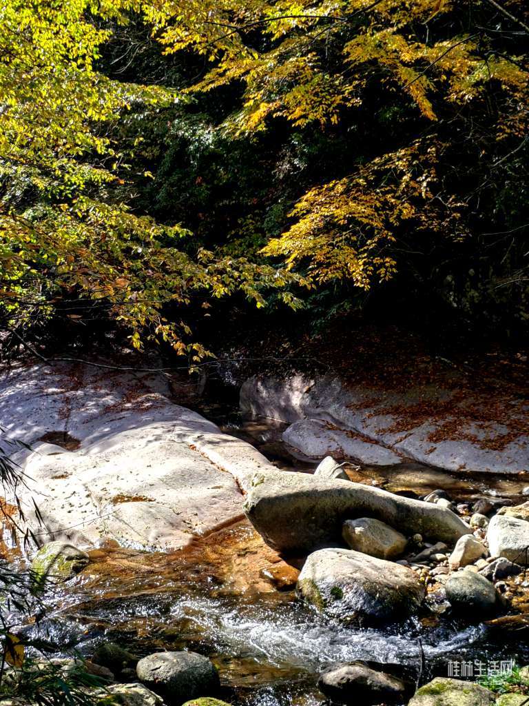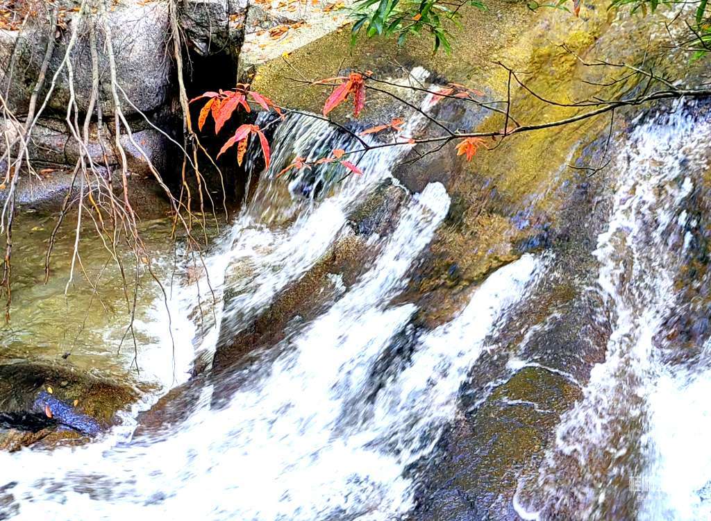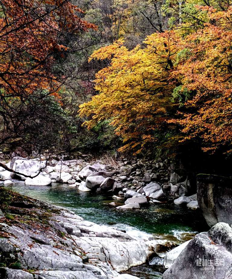 米仓山山峰连绵,山林中常有黑熊出没,公园里有座山的山形也恰似黑熊,山下那条溪水流淌的山沟,因此取名叫黑熊沟,十月的黑熊沟,溪水稍显干涸,溪中怪石嶙峋,一弘清水在红叶中蜿蜒曲行,红叶山石和清溪构成绝美的画面,宁静致远,着实让人难以忘怀。
