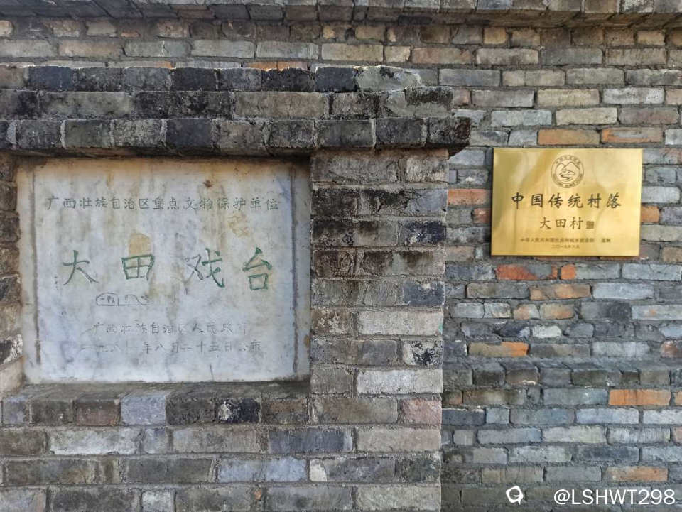 大田古戏台。位于贺州钟山县大田村,建于光绪四年(1878年),砖、石、木结构,呈平面凸字形。