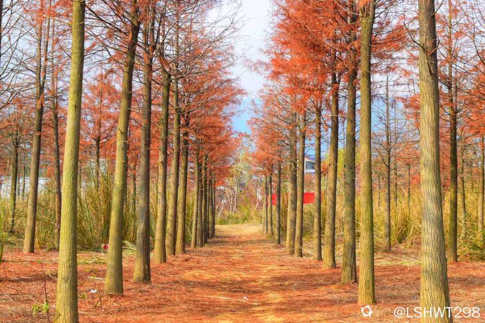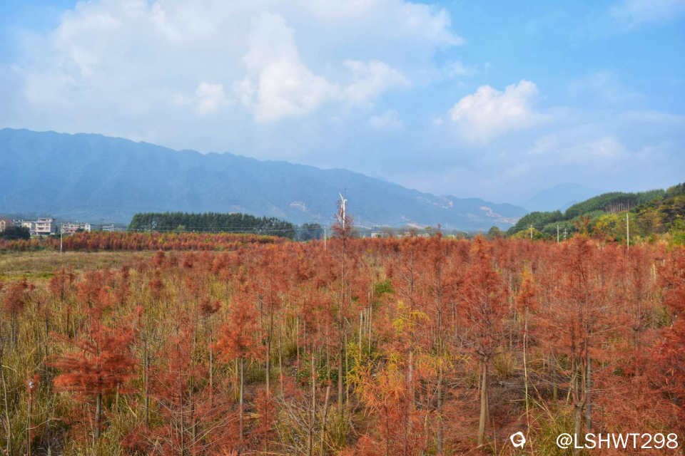 站于高处,乌桕、红杉林浑然一体,层林尽染。。