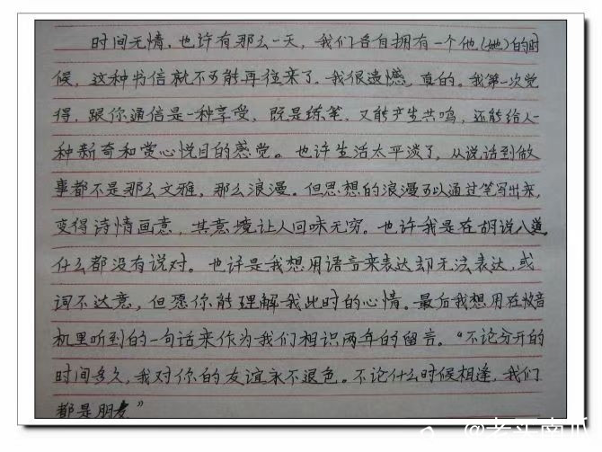 “时间无情,也许有那么一天,我们各自拥有一个他(她)的时候,这种书信就不可能再往来了。我很遗憾,真的。我第一次觉得,跟你通信是一种享受,既是练笔,又能产生共鸣,还能给人一种新奇和赏心悦目的感觉。”