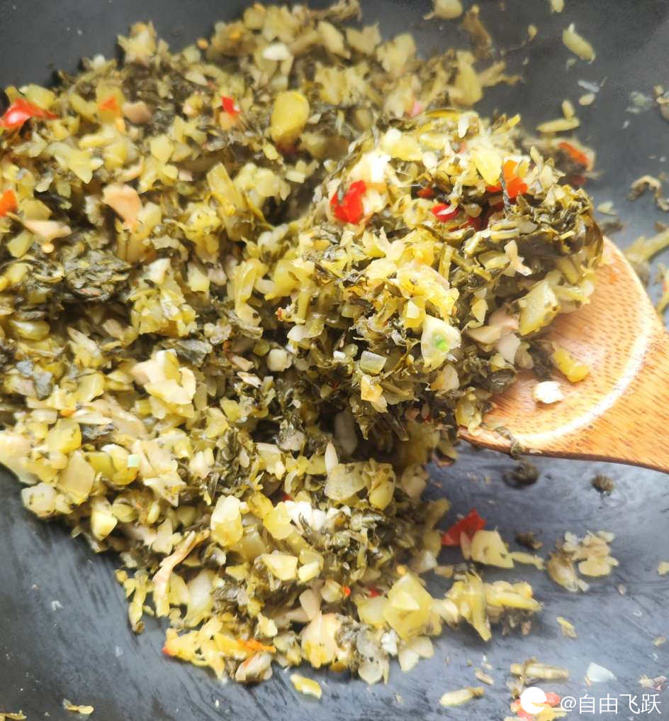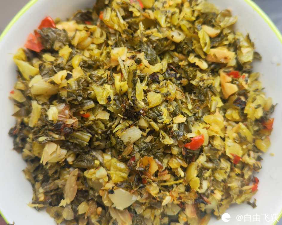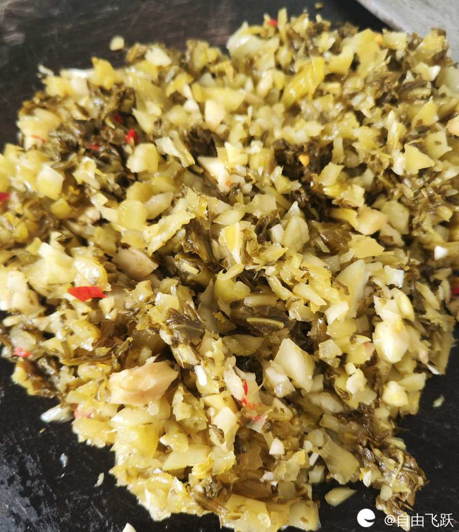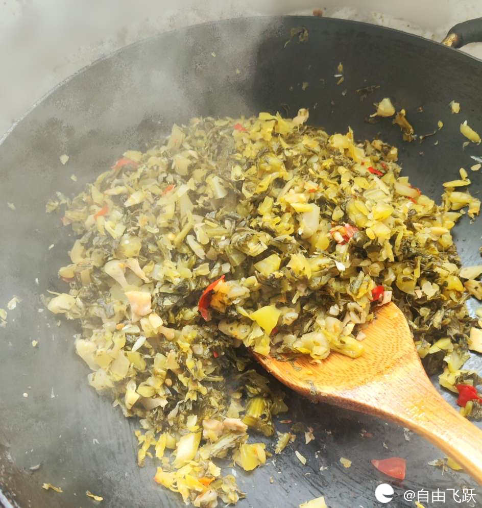 把腌好的酸盐菜剁碎,文火慢炒干,酸辣香随着蒸气飘散开来,闻着香气你会思考一些上剩的菜谱:酸菜鱼、肉沫酸菜、酸菜炒大肠、酸菜红烧肉、酸菜鸡、酸菜豆腐、酸菜炒饭,酸菜包子等等,然后哈喇子不由自主往下淌。
