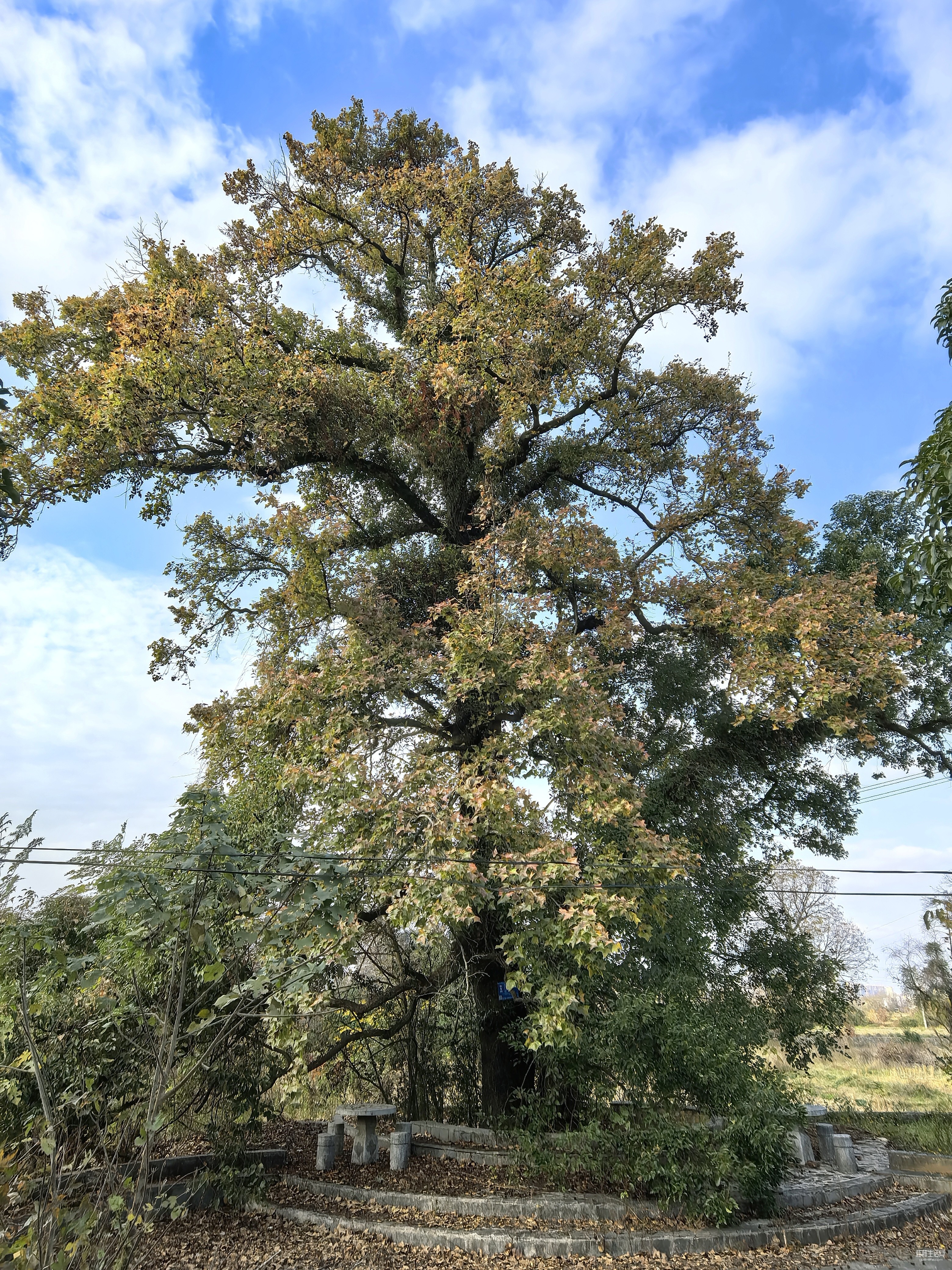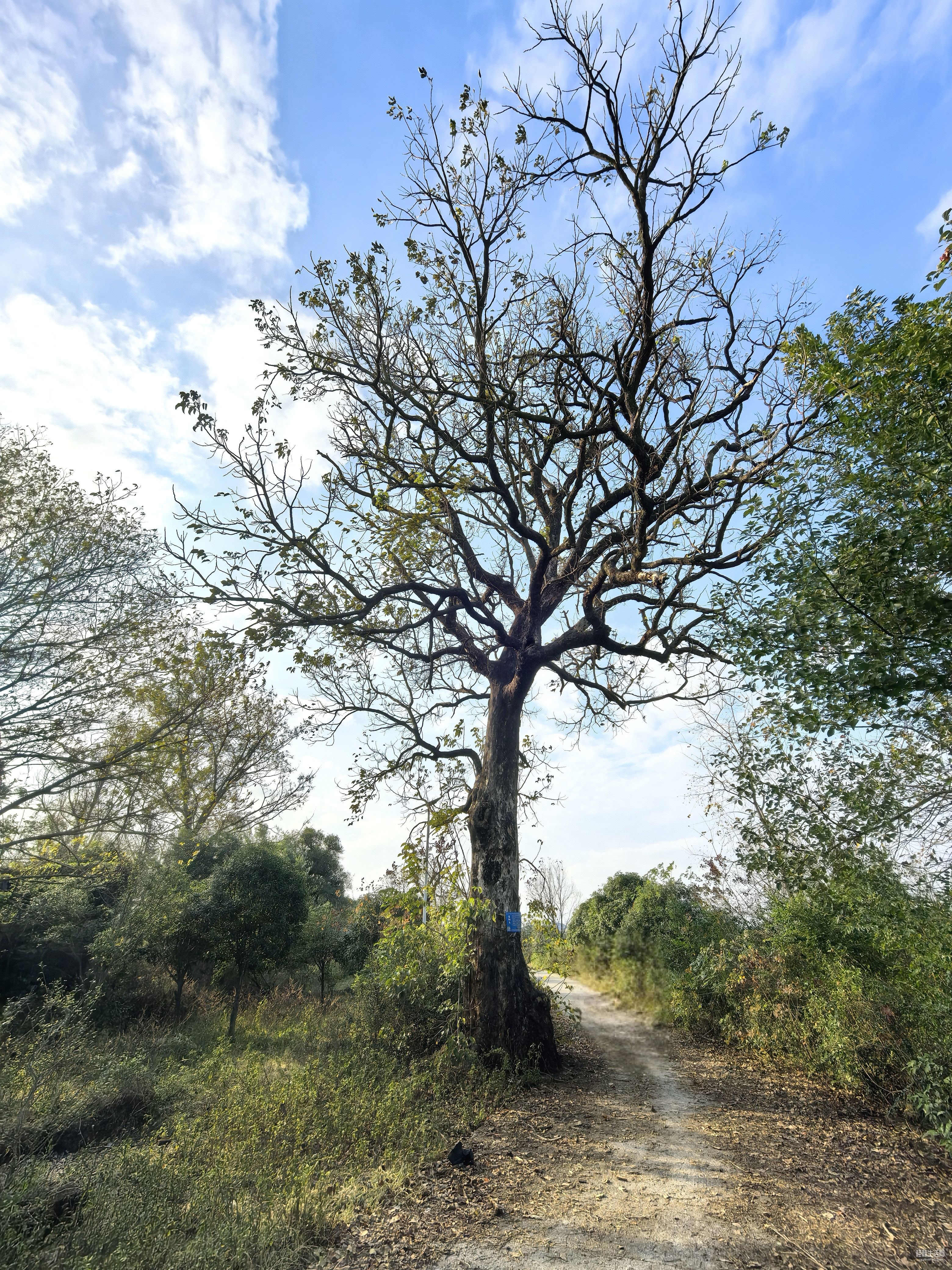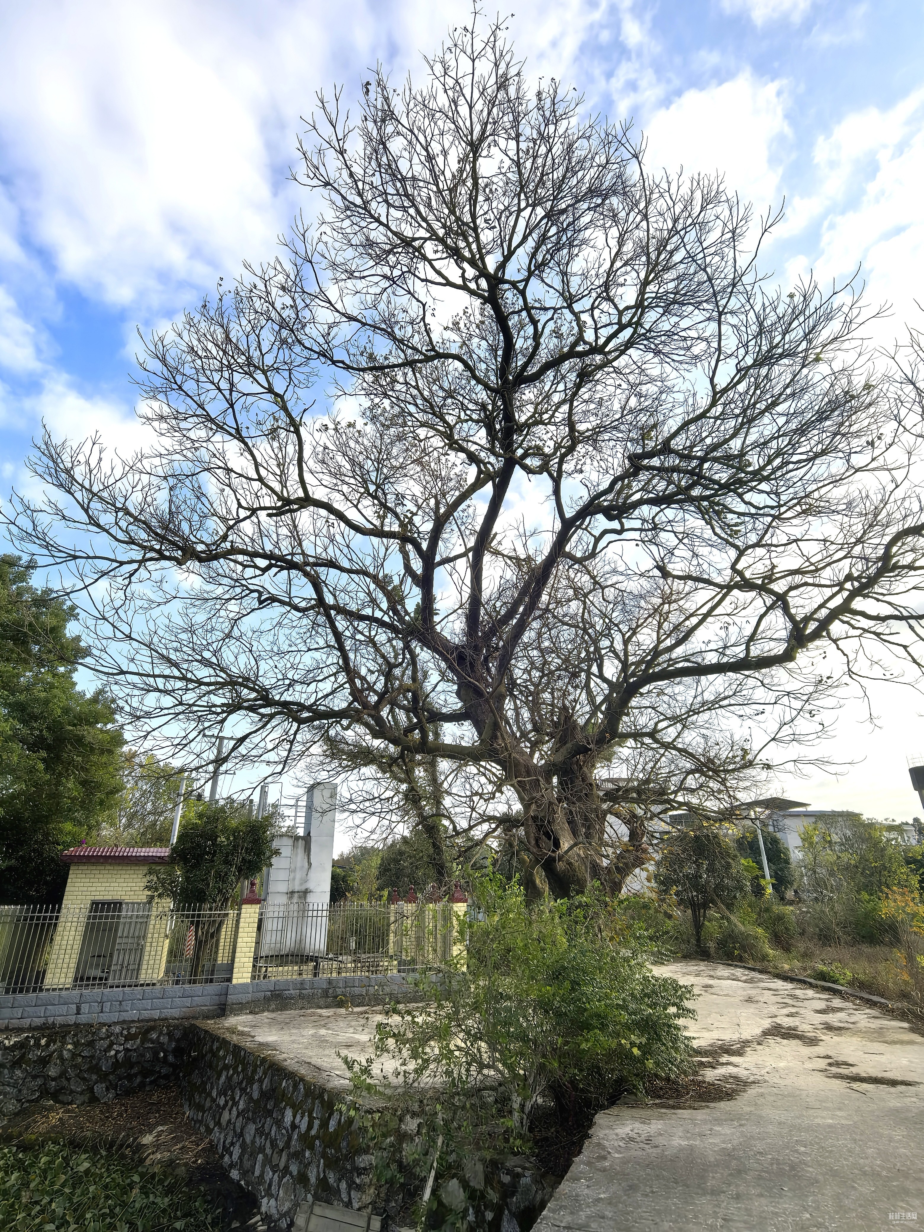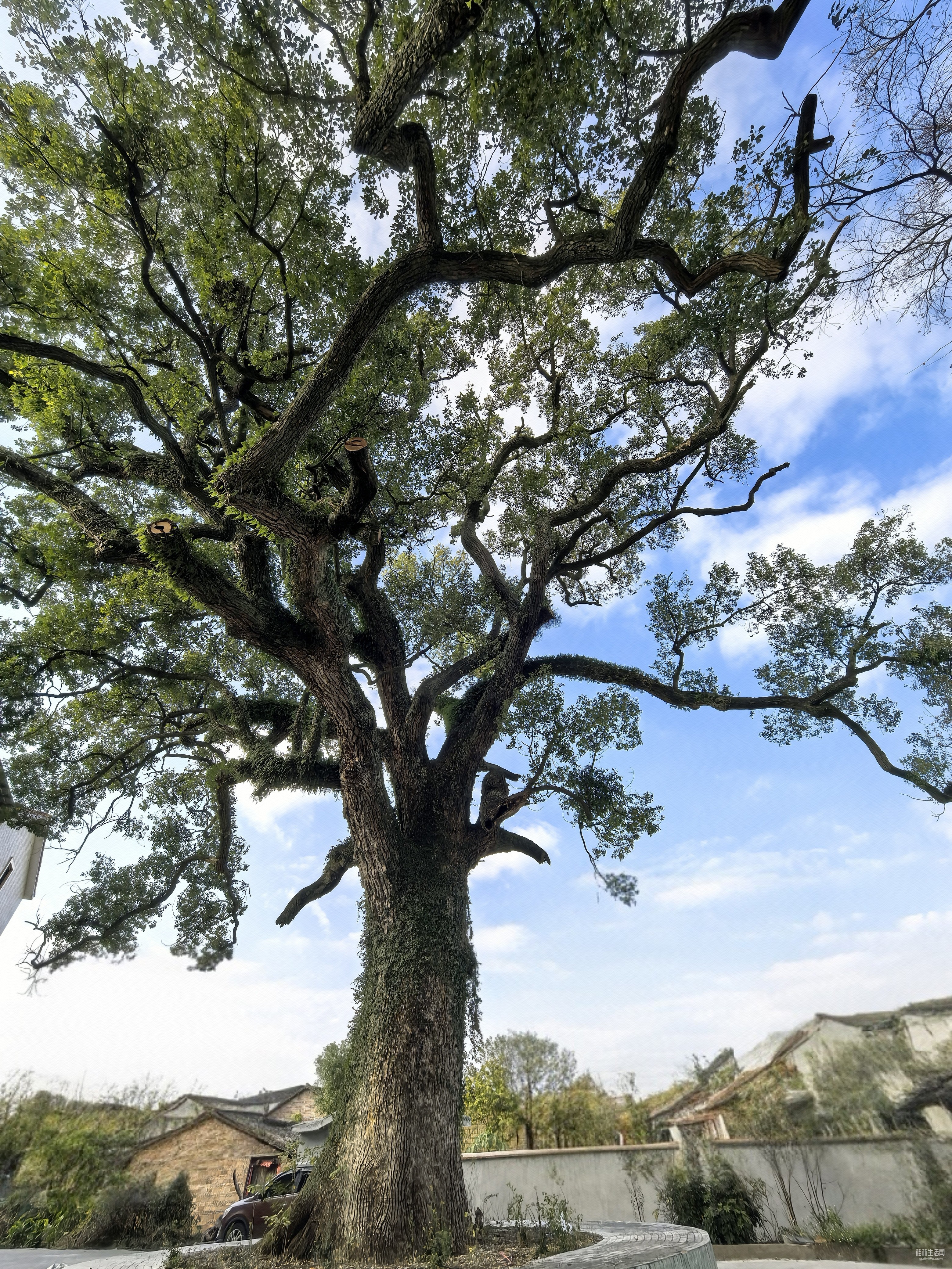 车窗外的风景渐渐换了模样,高楼褪成了低矮的屋舍,柏油马路也变成了蜿蜒的乡道;连风的味道都清冽起来,裹着泥土和干草的气息。刚进村里,就撞见了好几只土鸡,见了生人也不惊,照旧埋头寻觅食。村子里高高的重阳木落尽了叶子,光秃秃的树桠伸向蓝蓝的天空。还有好多大樟树,都有百年以上,有棵竟然有472年。