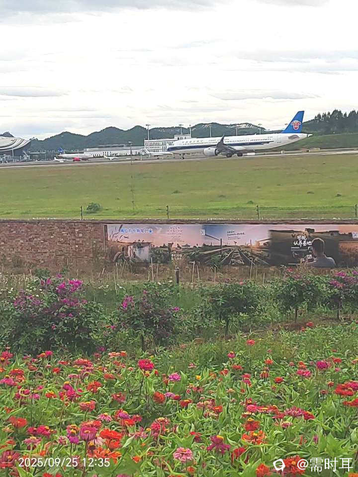 九月的一天我在两江机场花海拍飞机喲!