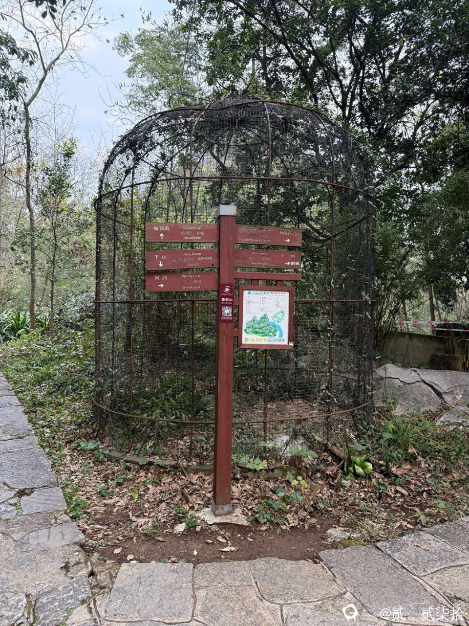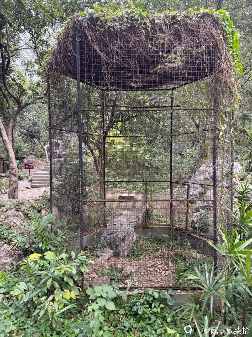 估计关仙鹤的笼子,仙鹤不见踪影。只剩生锈的大铁笼子!