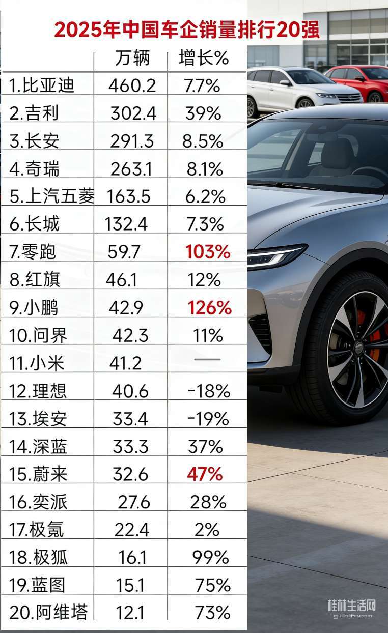 2025年中国车企销量20强榜单出炉,销量前5车企是比亚迪460.2万辆,吉利302.4万辆,长安291.3万辆,奇瑞263.1万辆,五菱163.5万辆。