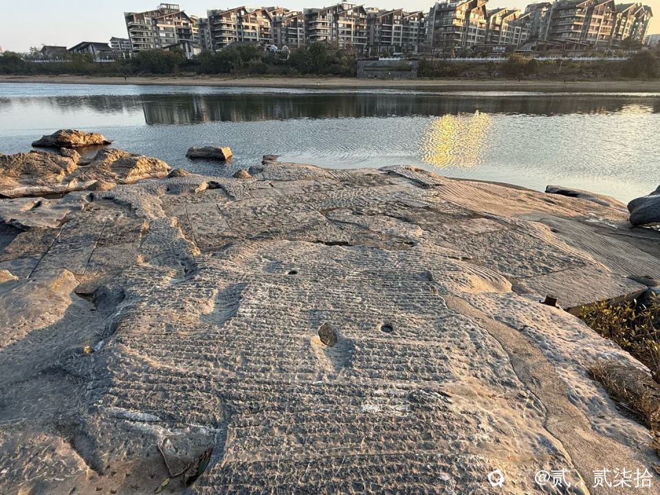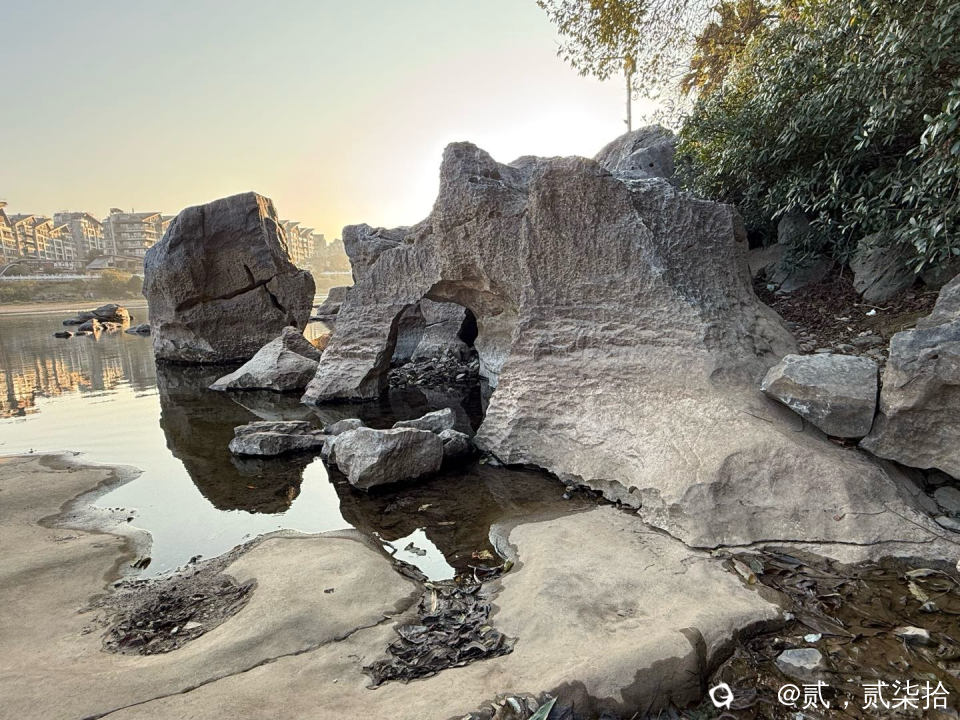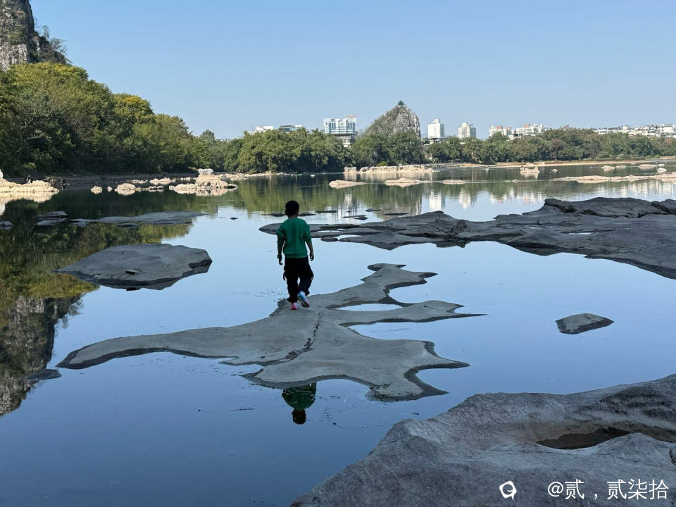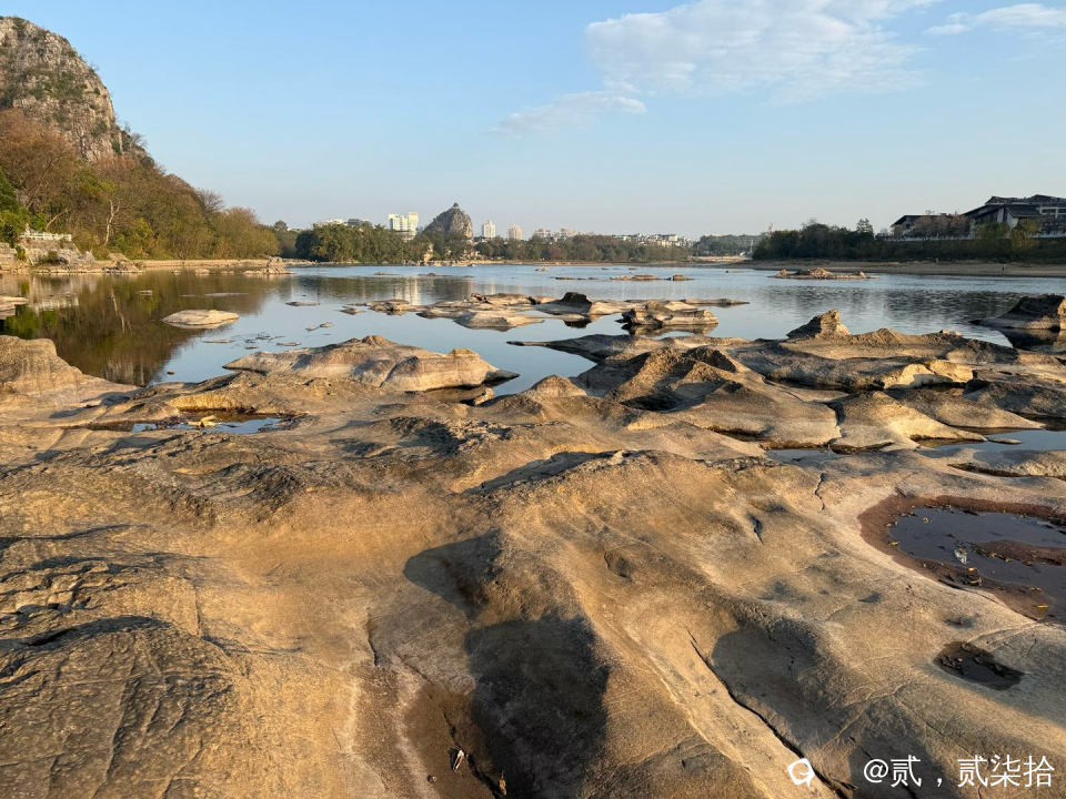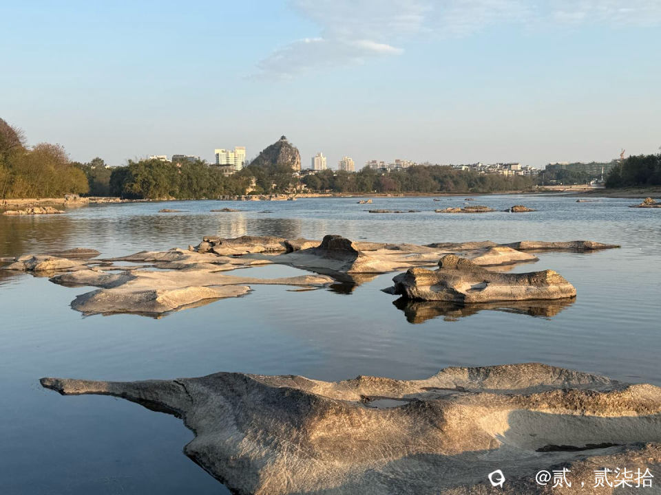 东镇门河里的石头怪好看的咧!想起曹操的诗,东临碣石,以观沧海!我想把它改成:东临漓江,以观怪石,水流缓缓……编不下去了