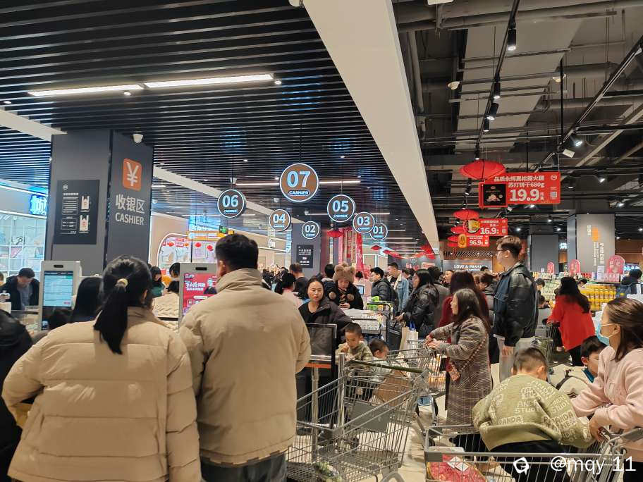 昨日桂林临桂新区的某超市,重新开业,超市内人山人海,要进超市还得绕圈圈排队才能进入。