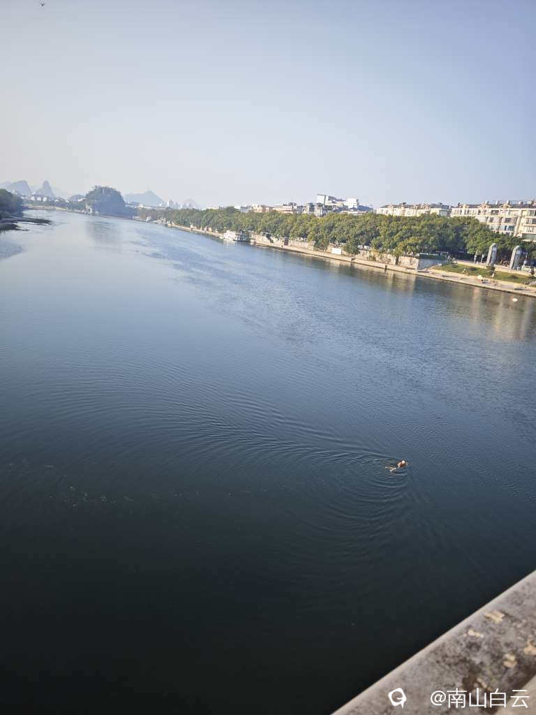 慕然,只见漓江水面上空,一群白鹭翩翩起舞,仿佛在向这座清晨的城市问好。与此同时,江中有三个勇士在冬泳,其中有个女的,真的是巾帼不让须眉。