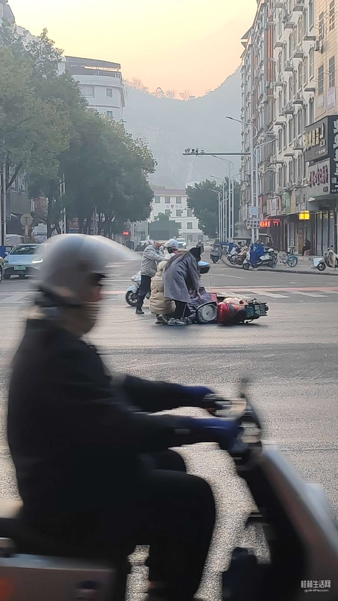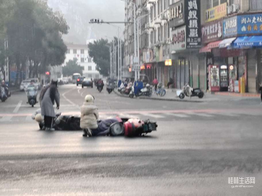 早上忙碌一天的开始,还是之前说的临桂人民路二塘老菜市口这个交通路口,两个电动车相撞,双双倒地。