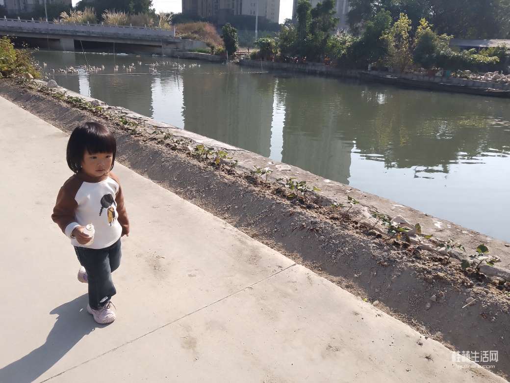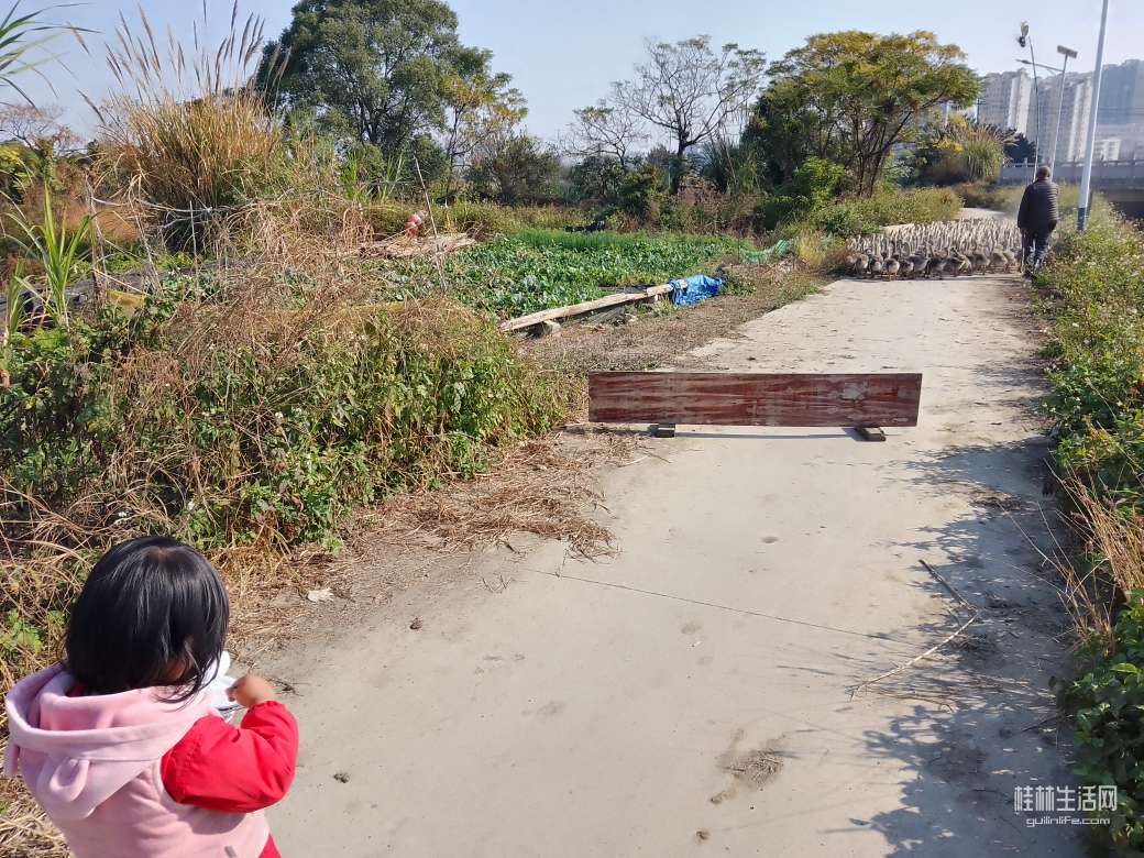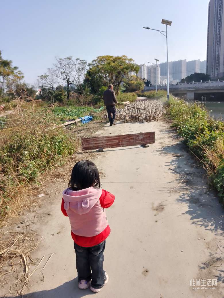 这附近有个养鹅场,遇到一个老人在赶狮头鹅去河对面……
