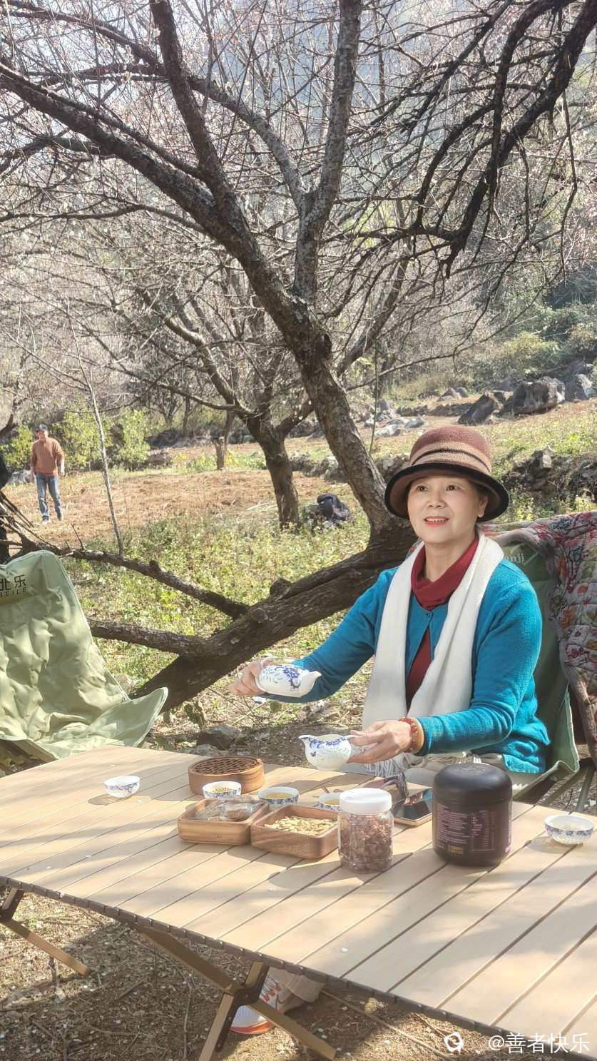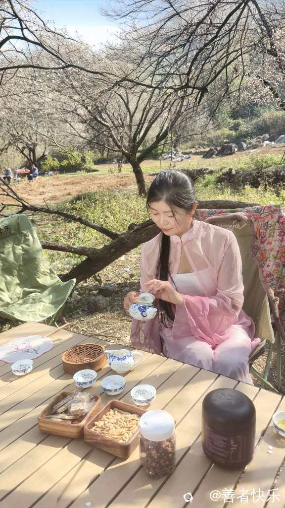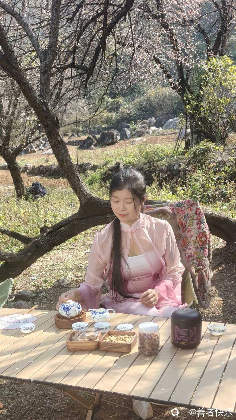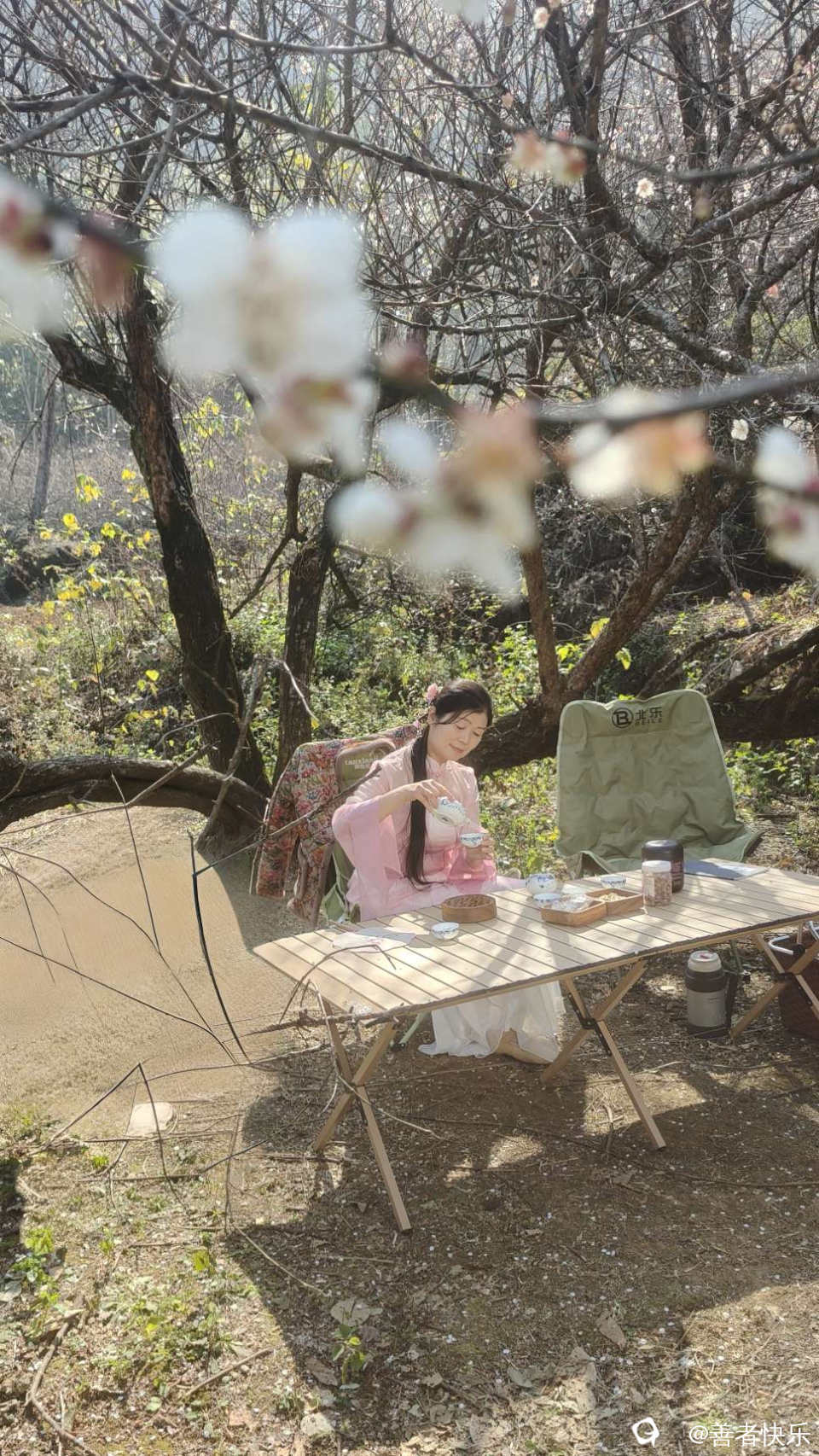 平乐张家镇水山村,歪脖子网红青梅花树的确漂亮让人向往打卡,环境美不胜收,青梅花树下围坐品茶,举杯笑语闻香,此景仪式感满满!#平乐张家镇水山村