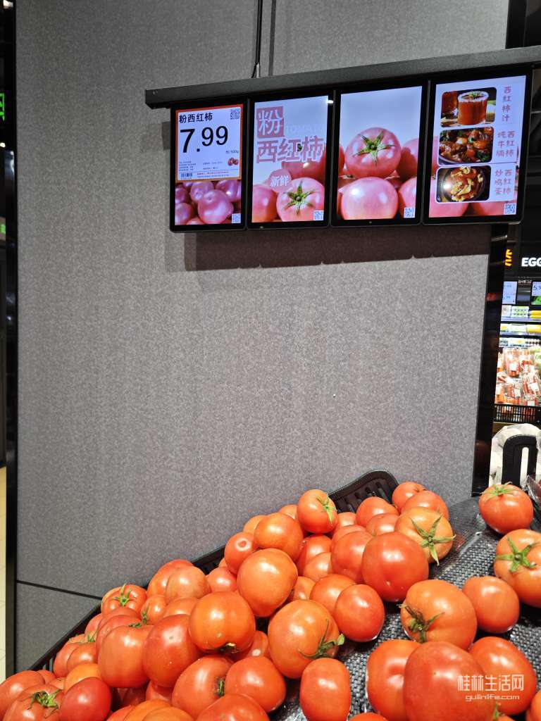 在西红柿摊上的电子价格是7.99元一斤,有点意外。现在黄金白银上涨,怎么西红柿的行情也走高。听说全国西红柿价格都在涨,比去年同期同比上涨80.9%。西红柿含有丰富的维生素A和维生素C,还可以降低患癌的风险。也许吃的人多,供求关系影响价格。我装了两个,价格显示8.34元,好家伙,比吃猪肉贵。