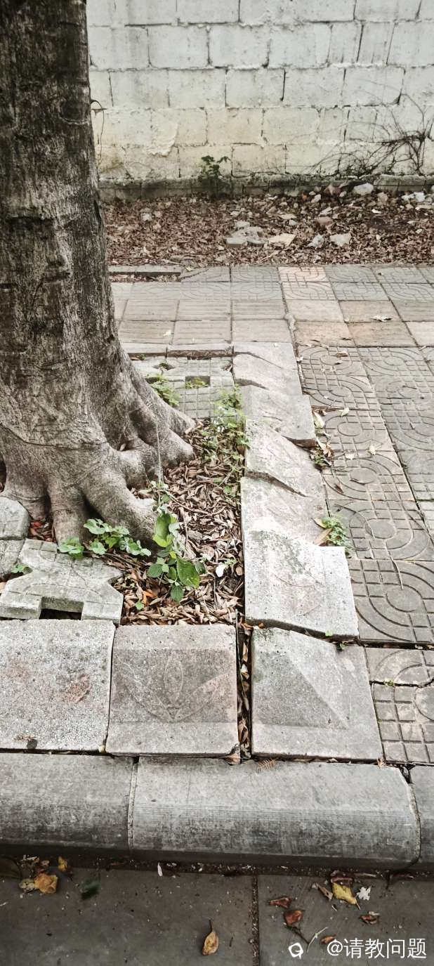 树旁边斜形的砖块。