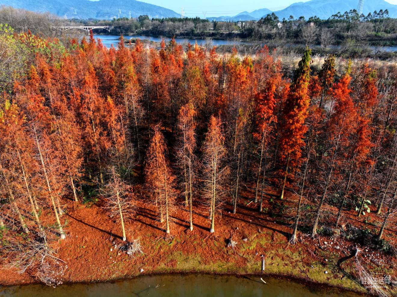 深冬时节的红杉褪去青绿,被季节染成从浅绯到炽红的渐变色谱,同一棵树上竟能望见金黄、赭石、砖红交织的层次,像凝固的霞光倾泻在江畔。