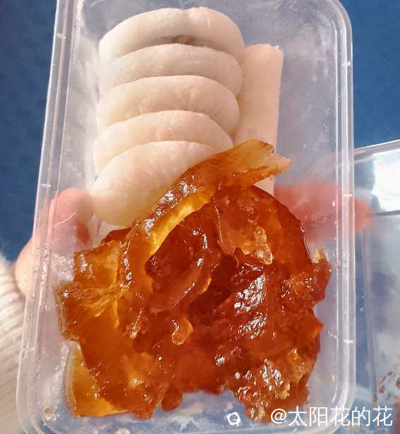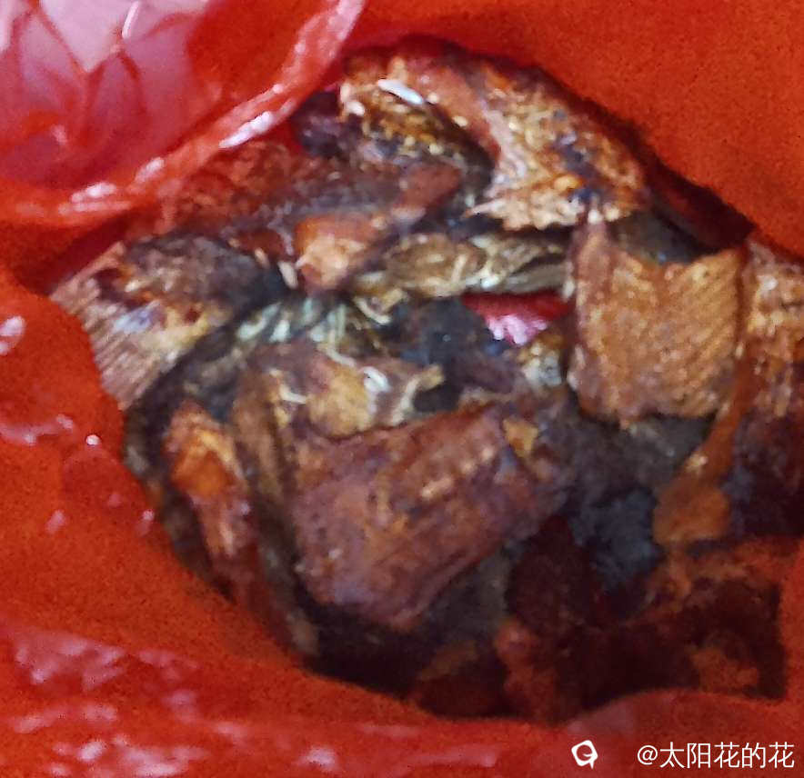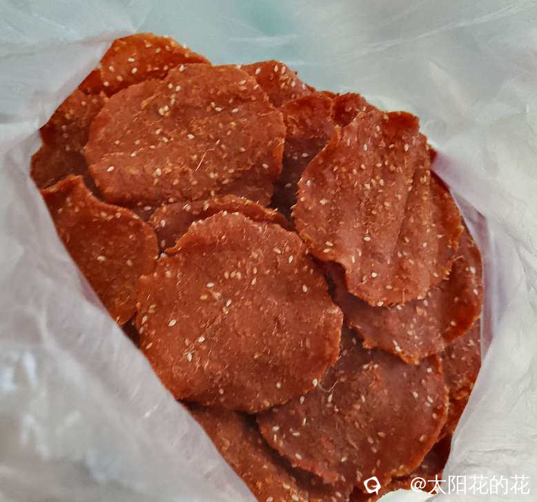 红薯片是亲戚自己做的,这个是用很甜但不怎么粉的那种红薯做的,老家有另外一种用很粉的白肉红薯做的红薯片,那个用油炸了特别好吃……小时候去亲戚家拜年很多人家里都会炸那个,现在已经很少见到了……