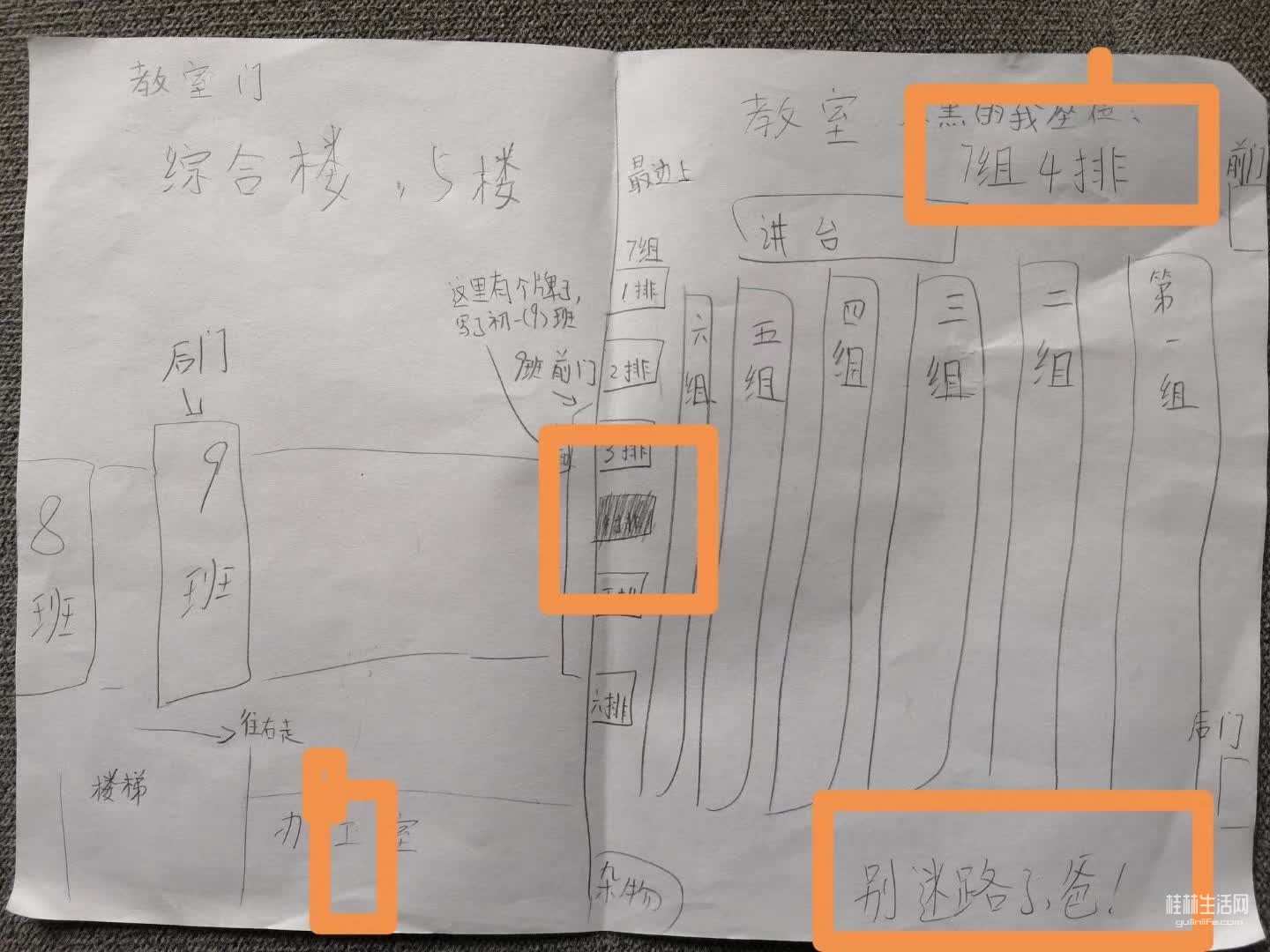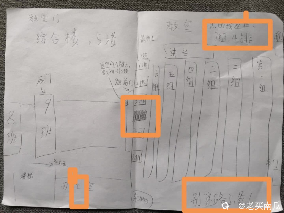 下午准备第一次参加孩子的家长会,孩子特意准备了教室班级分布示意图,一句“别迷路了,爸!”,虽然越看越糊涂,但还得感谢孩子的“良苦贴心