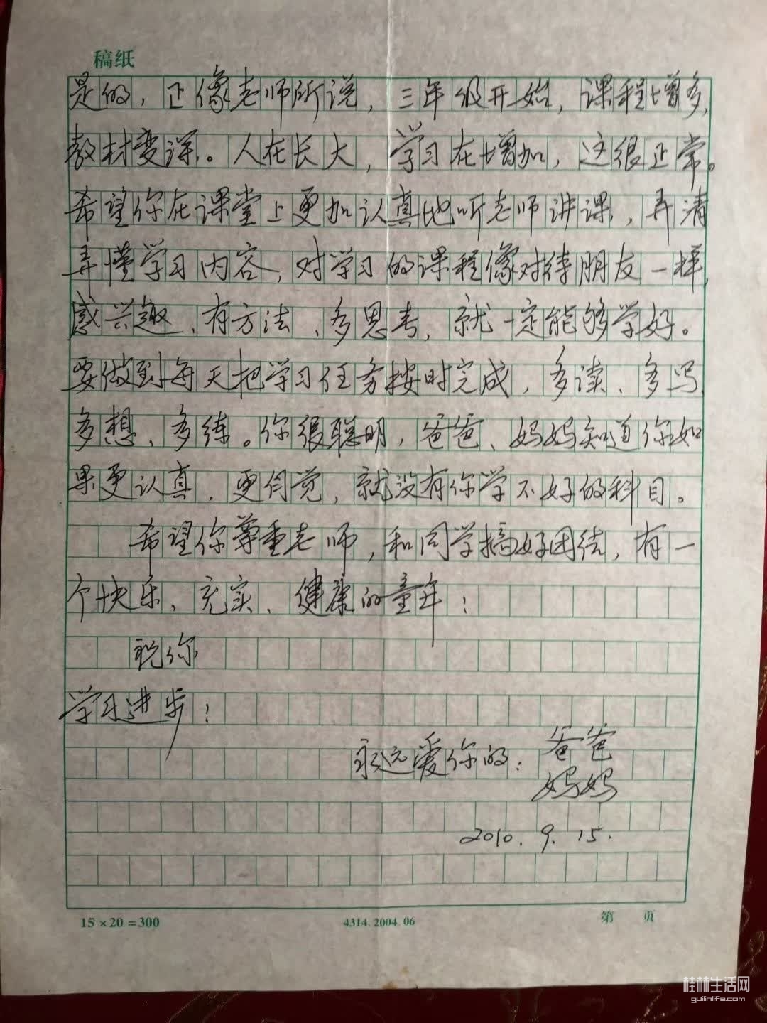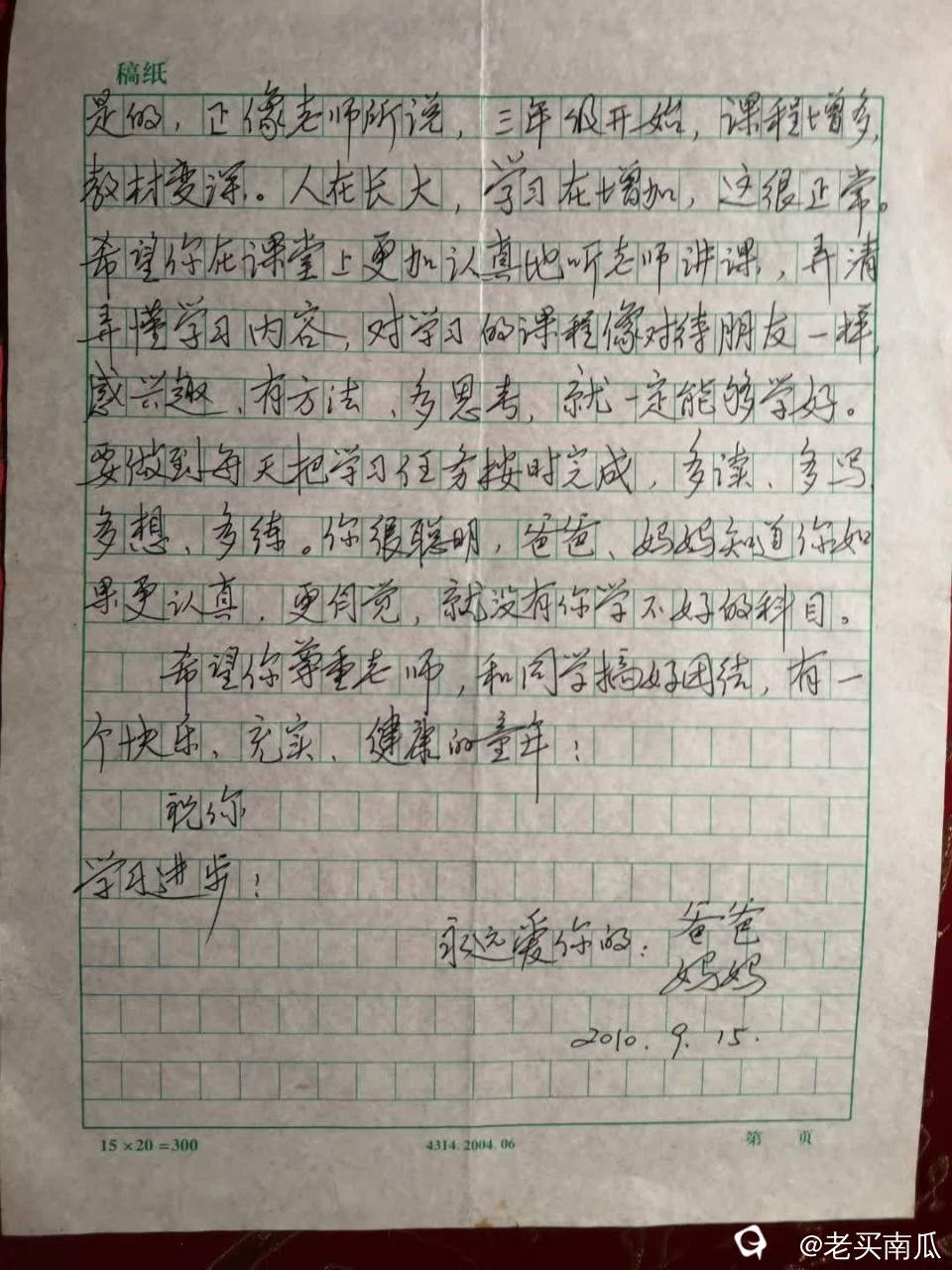 孩子学校的期刊《绽放》里的《一封家书》栏目向我约稿,我写给孩子的家书挺多的。忽然想起读高二的大孩子了,不经意捧出八年前写给孩子的信,那时候才上小学三年级呢,现在快16岁了,连老二都上初一年级了,不舍昼夜的岁月啊!