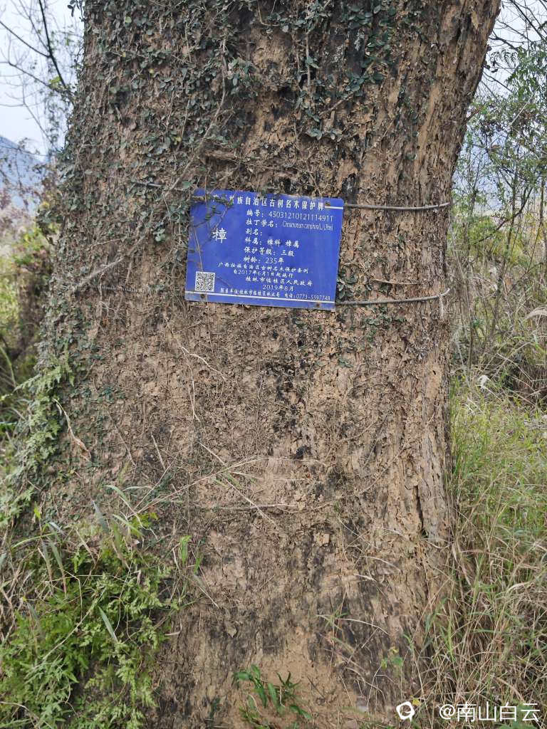这是一棵大樟树,年龄有230多岁了。樟树属于常绿大乔木,高大挺拔,主要生长于中国南方,桂林各地都有。但由于上世纪五十年代大炼钢铁砍伐殆尽以及其他因素,桂林的古樟树很少见了,所以政府部门给古树立牌,纳入信息管理与信息系统,科学保护。这是绿水青山就是金山银山国策体现。