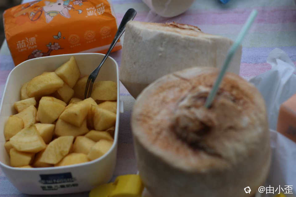 椰子用来打汤椰子鸡,苹果从家里带好,一小块一小块均匀切好。