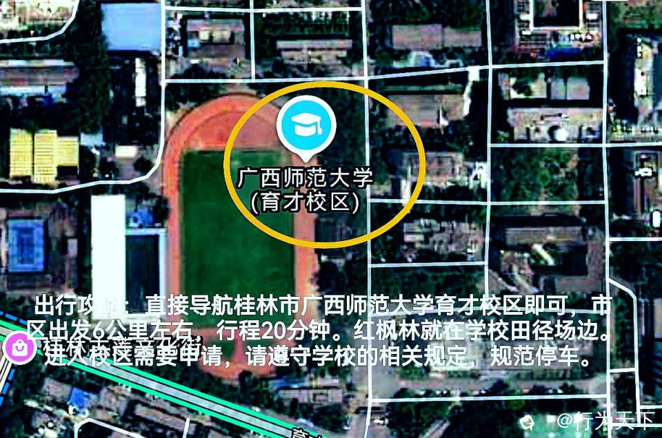 直接导航桂林市广西师范大学育才校区即可,市区出发6公里左右,行程20分钟。红枫林就在学校田径场边。