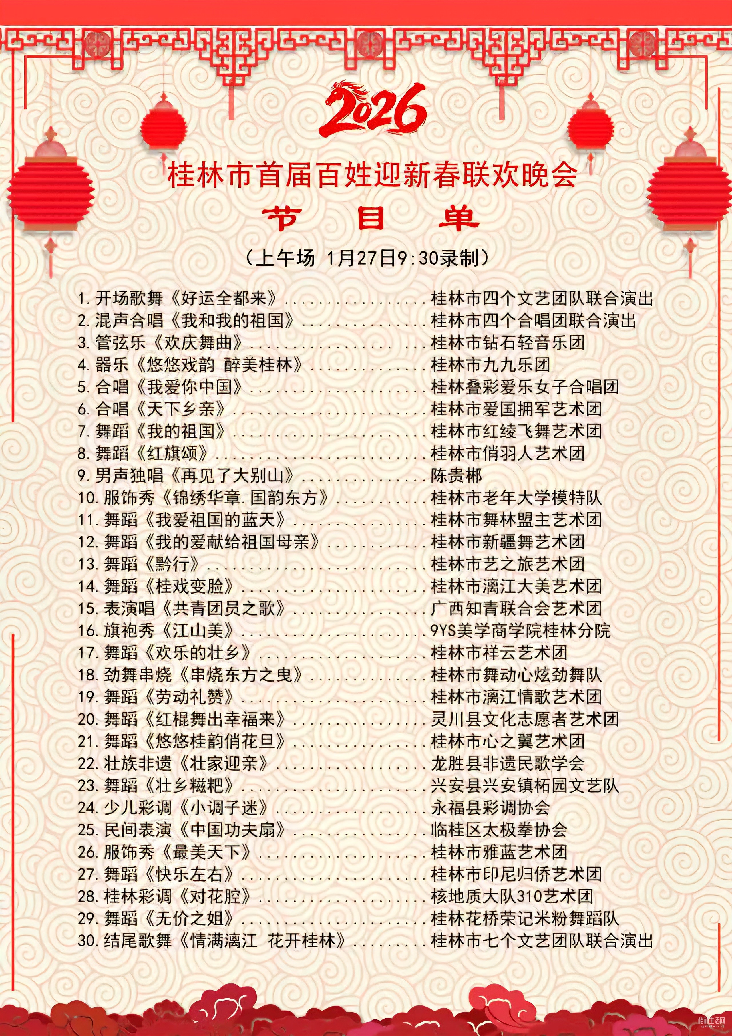 我参加了第二个节目明天上午9:30在漓江剧场录制,大年初一桂林电视台黄金时段播放