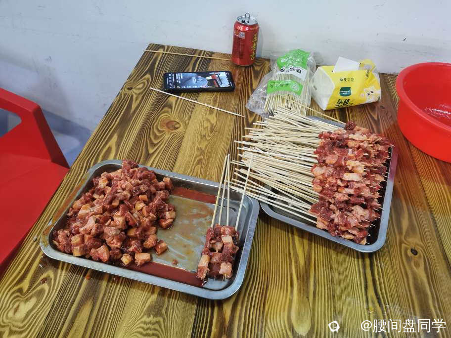 串完鸡翅再串肉肉,边串边刷视频,一看就是老江湖了,阿姨,我也想来打工,擦桌子扫地都阔以滴~