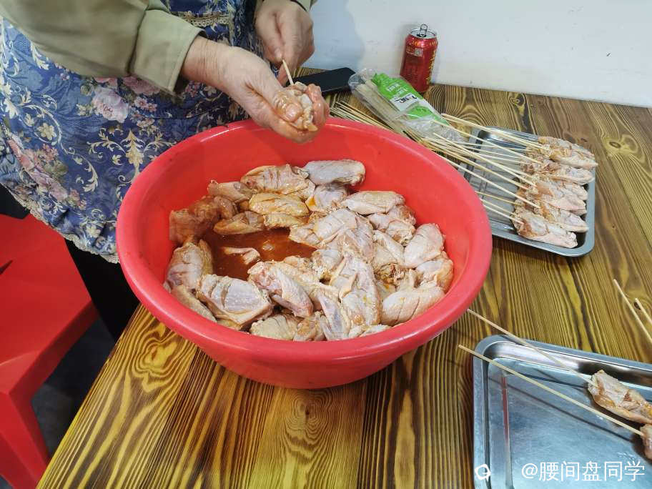 阿姨串鸡翅膀的手真麻利,一戳就进去了~
