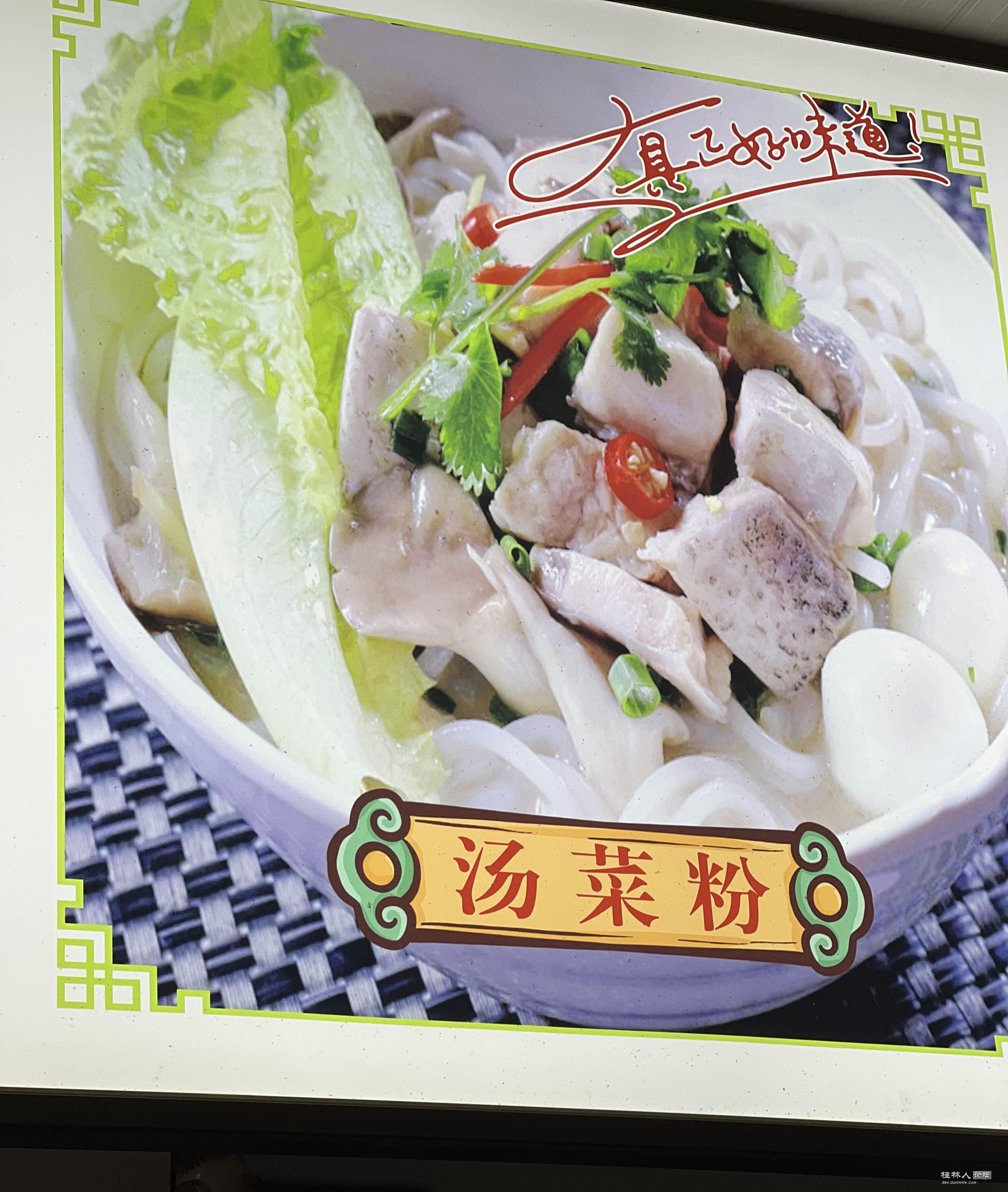 某天早上在我们小区楼下的米粉店吃米粉,我们小区在桂林某所大学旁边,来了一个可能是第一次来吃粉的外地女人,看了店里的图片很久,说要一碗汤菜粉,如上图。