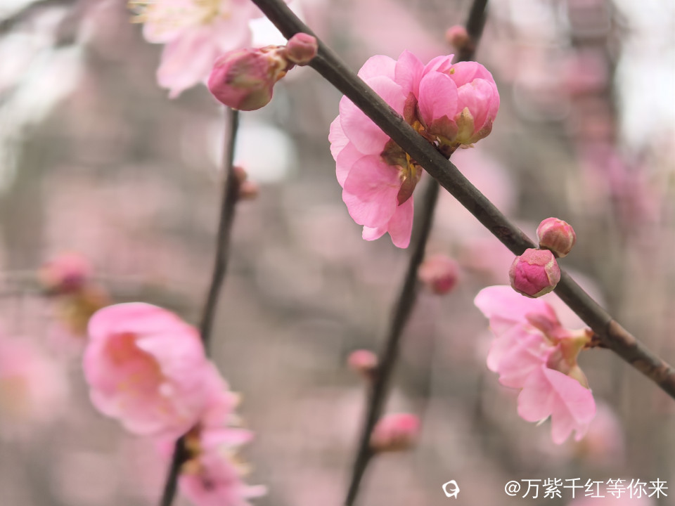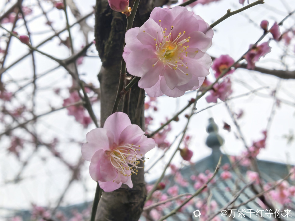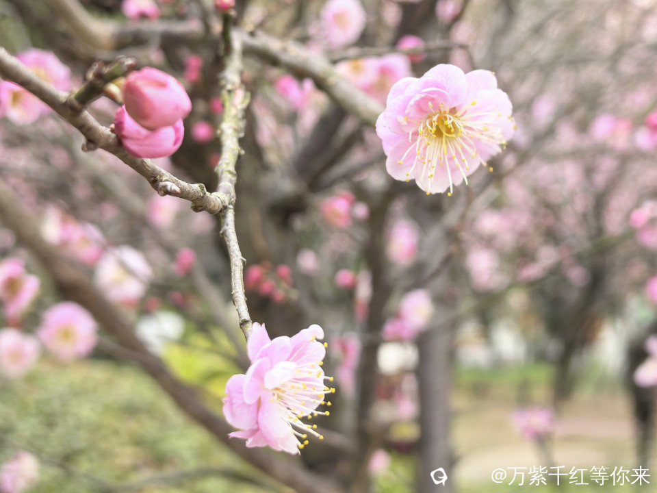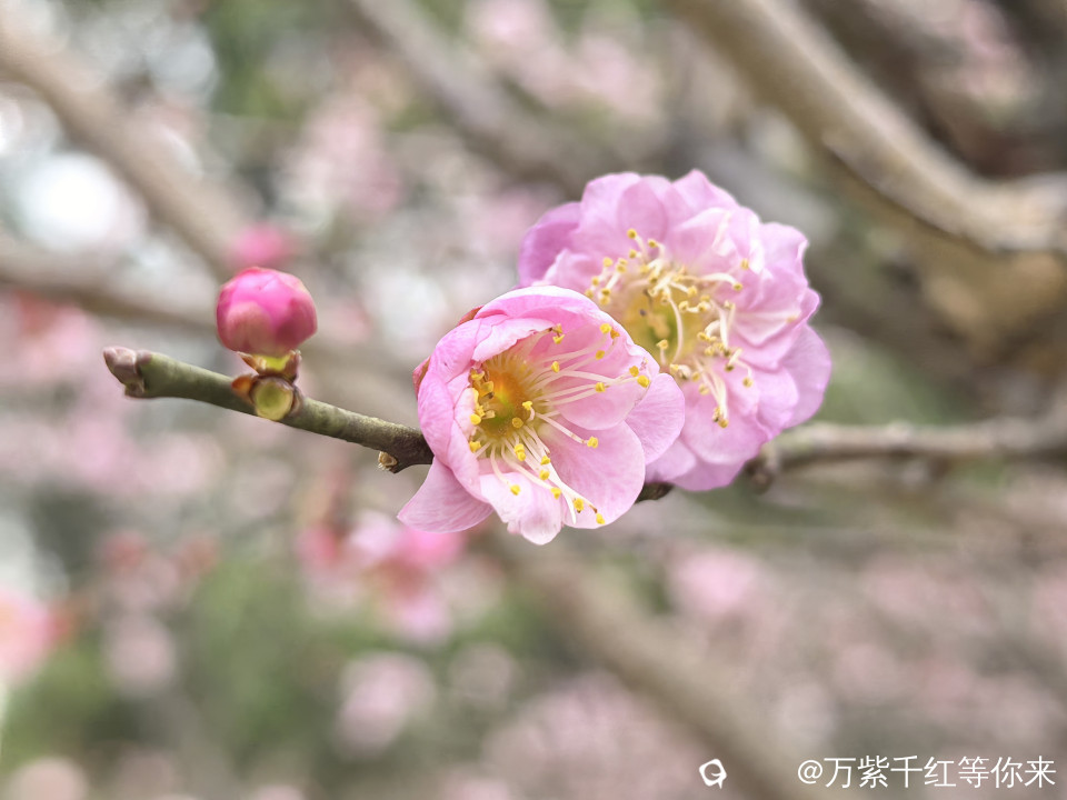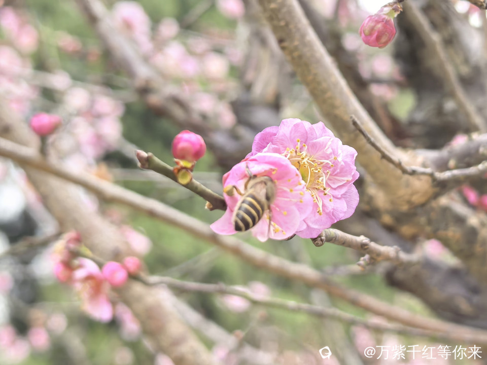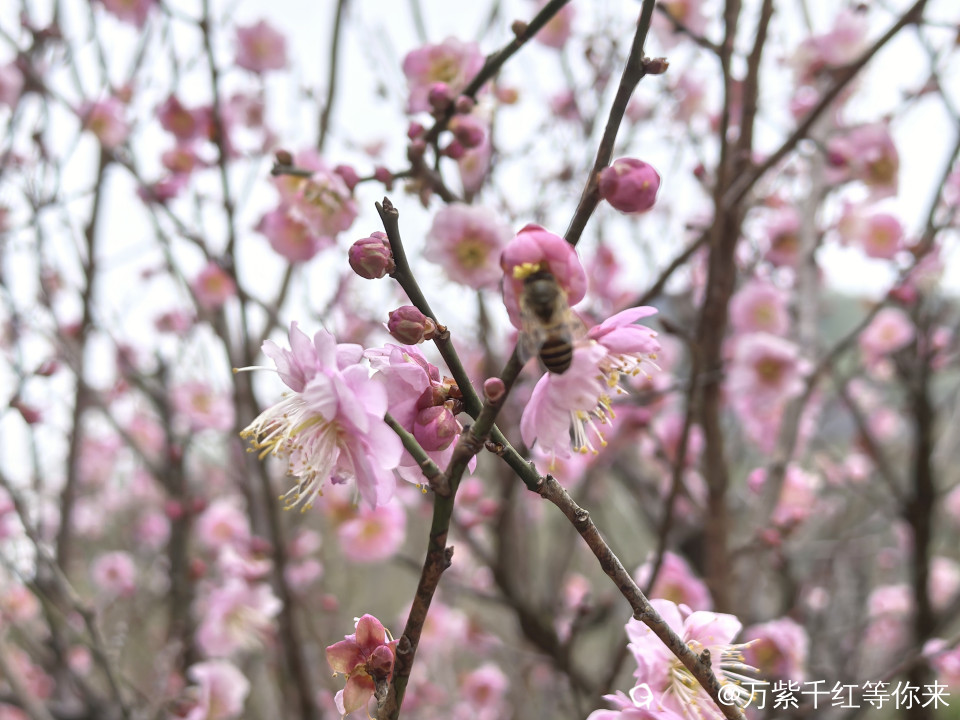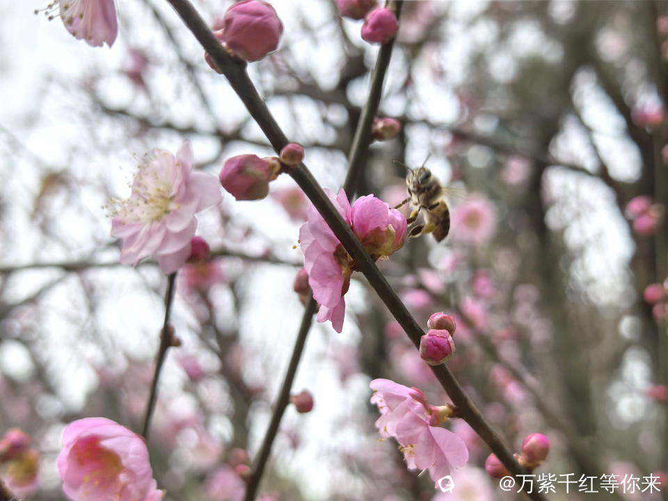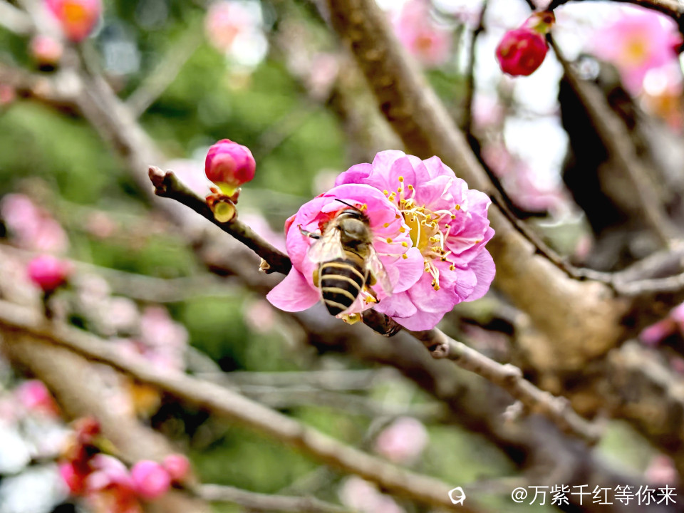今天走进西山公园晓苑,一缕清冽的暗香就顺着风扑面而来;一株株梅树满枝繁花,有粉色的、桃红色的缀满枝头,花瓣中金黄色的花蕊引得蜜蜂流连。
