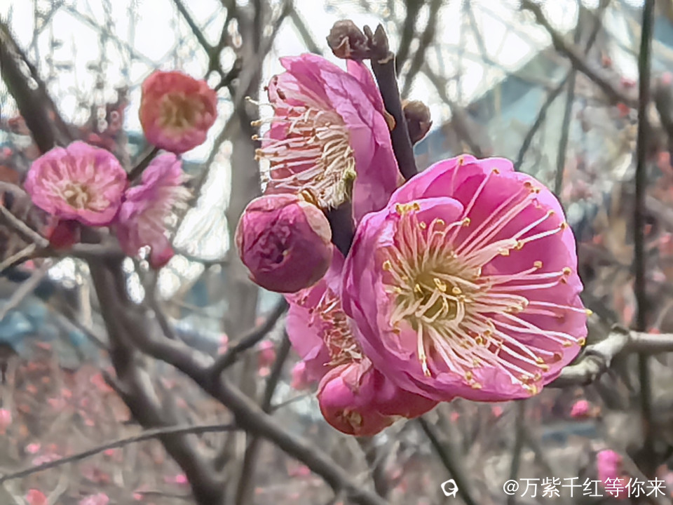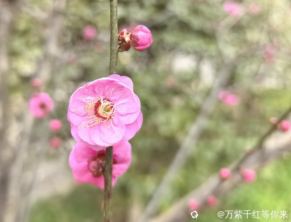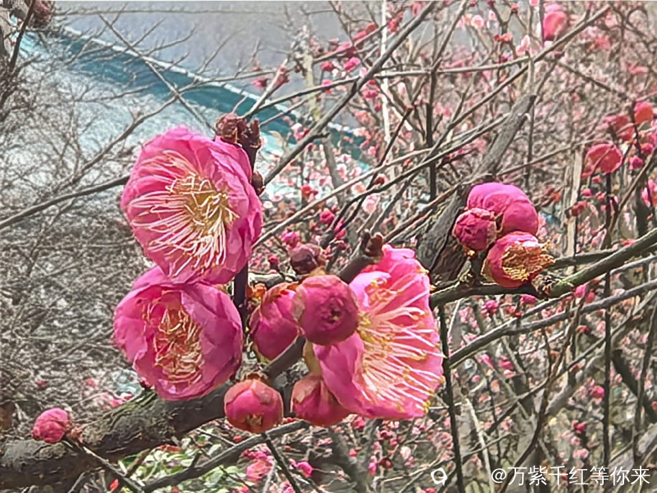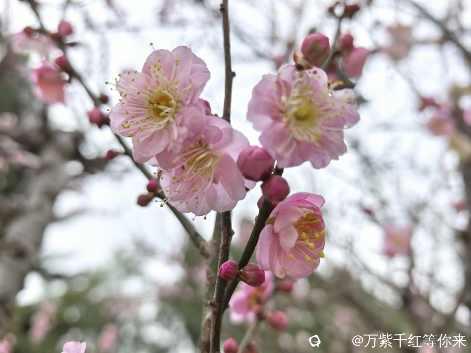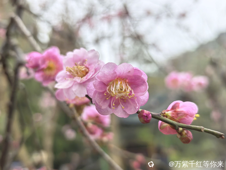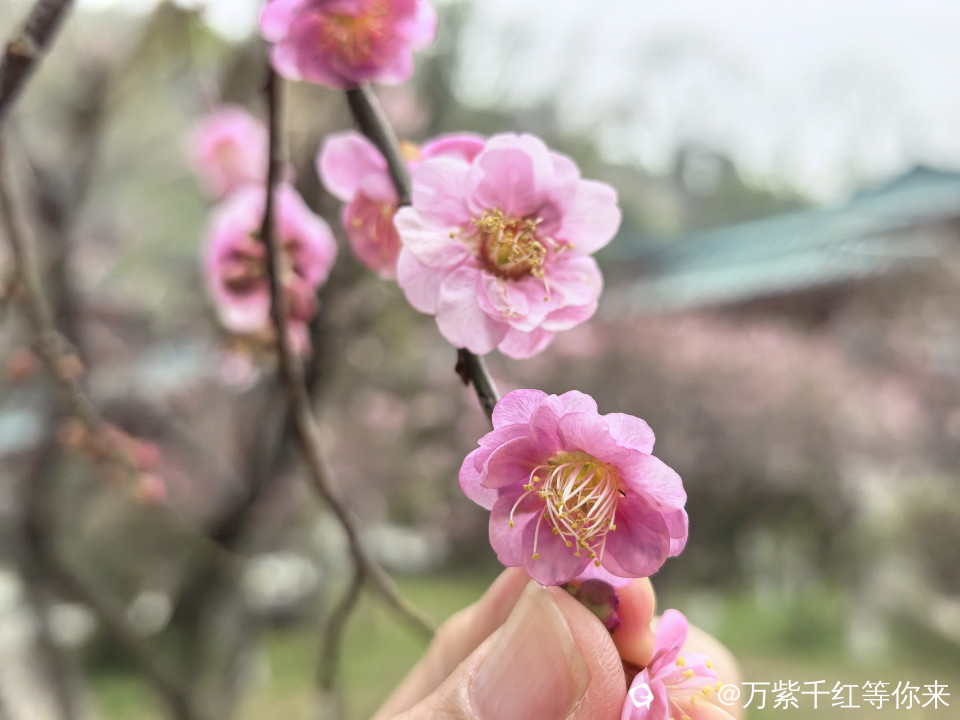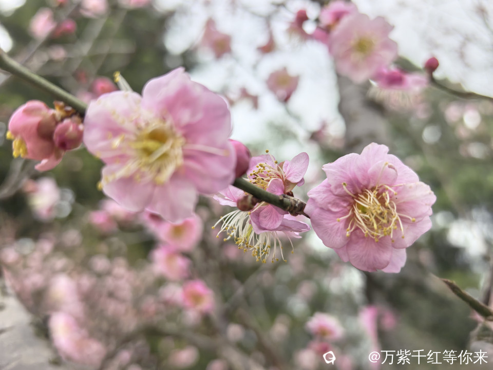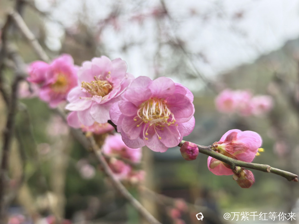 今天走进西山公园晓苑,一缕清冽的暗香就顺着风扑面而来;一株株梅树满枝繁花,有粉色的、桃红色的缀满枝头,花瓣中金黄色的花蕊引得蜜蜂流连。