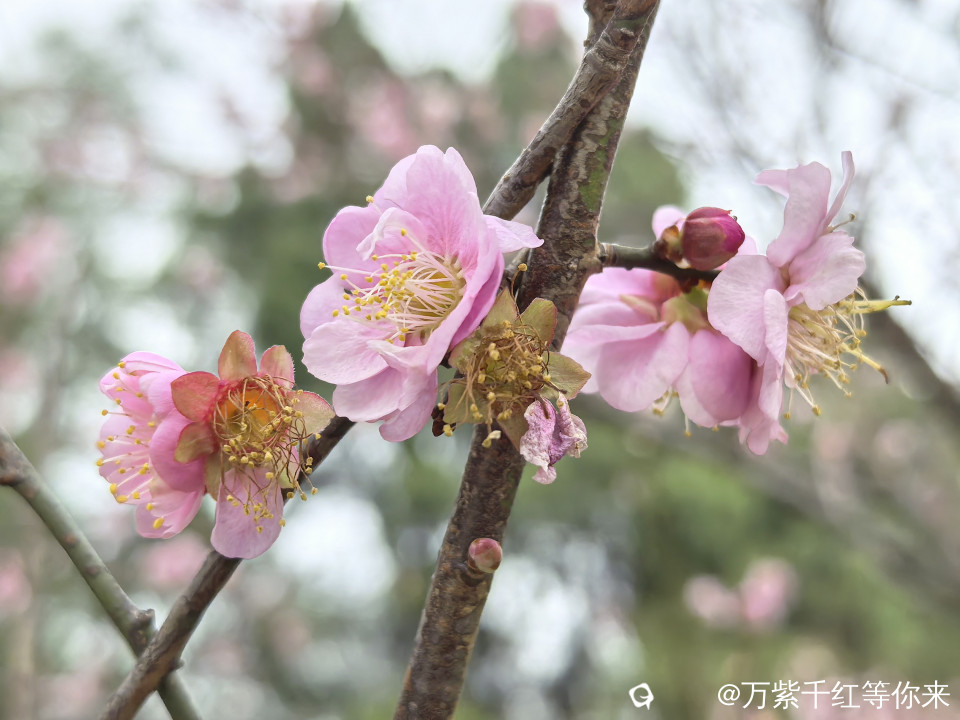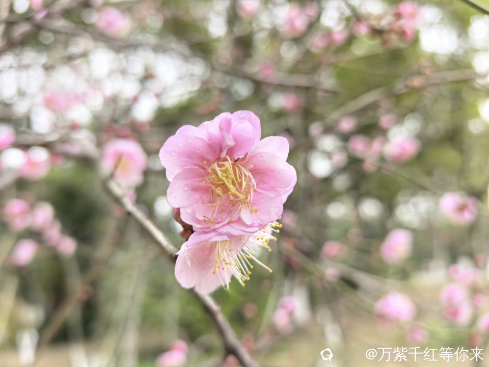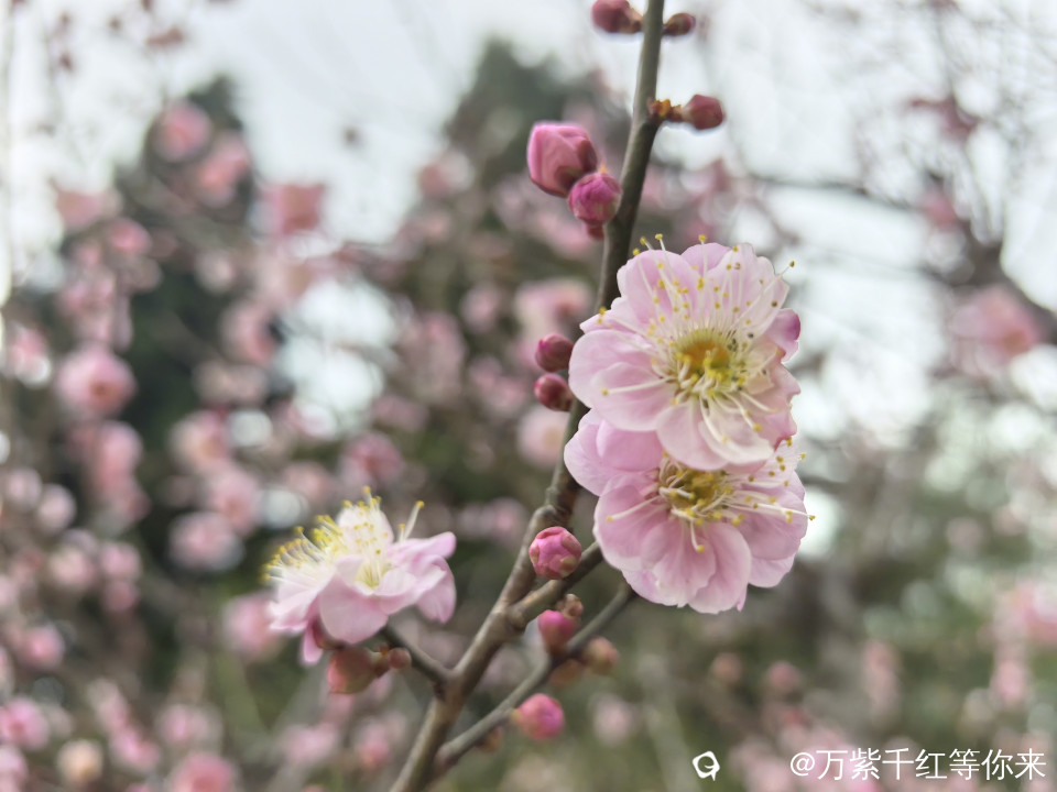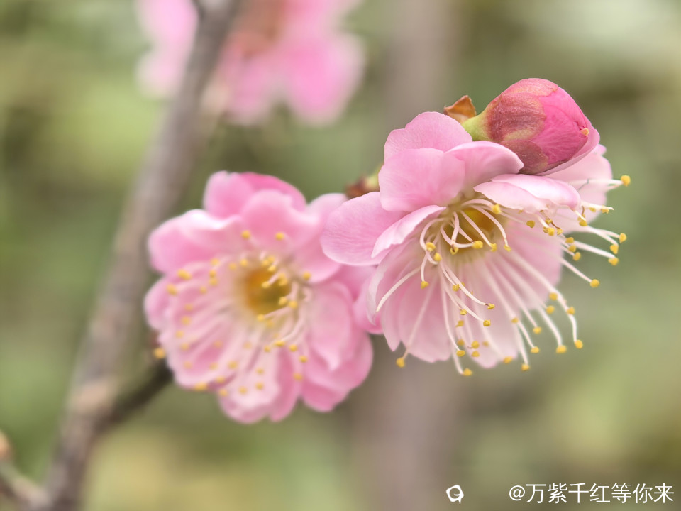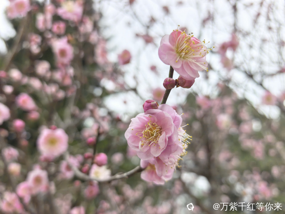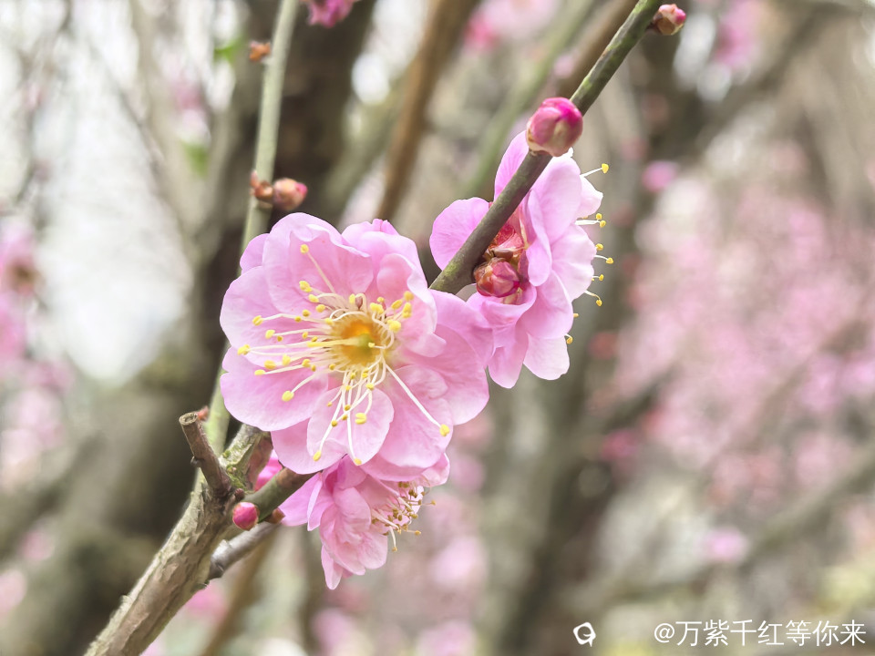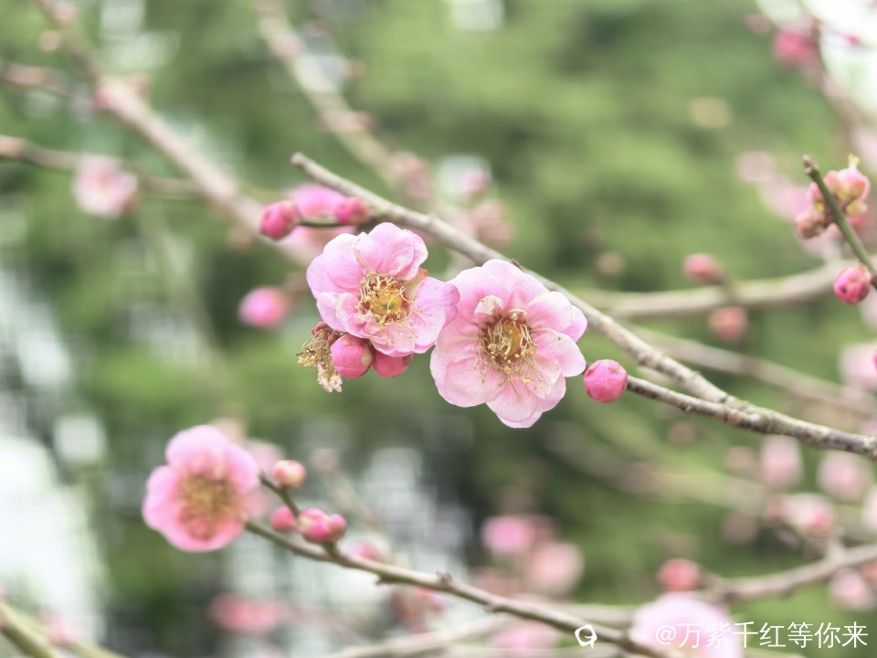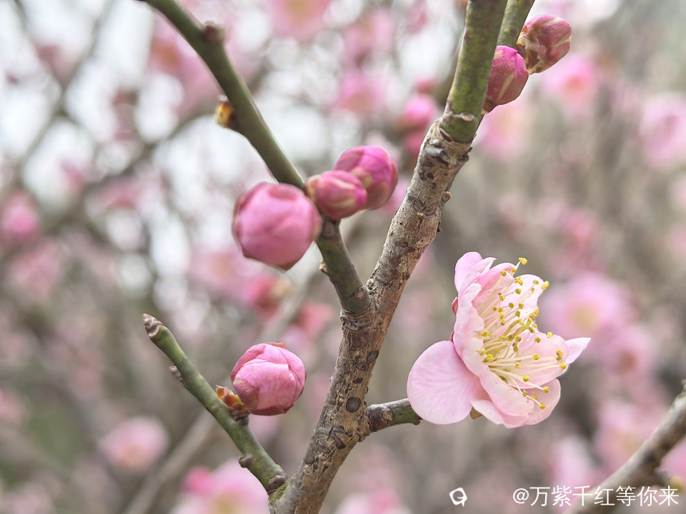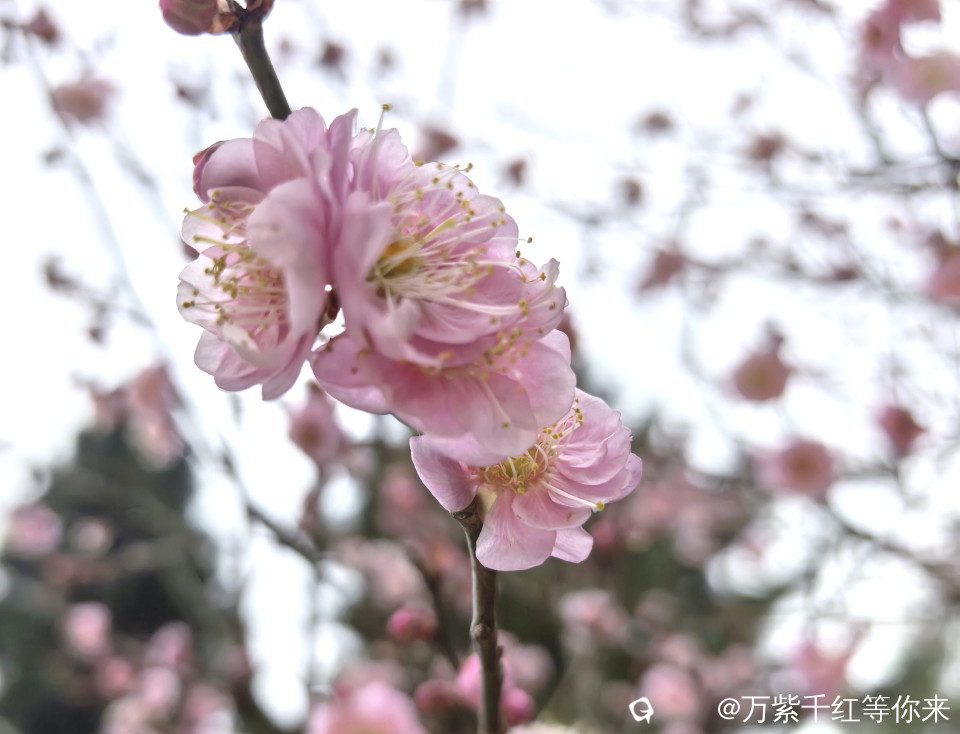 今天走进西山公园晓苑,一缕清冽的暗香就顺着风扑面而来;一株株梅树满枝繁花,有粉色的、桃红色的缀满枝头,花瓣中金黄色的花蕊引得蜜蜂流连。
