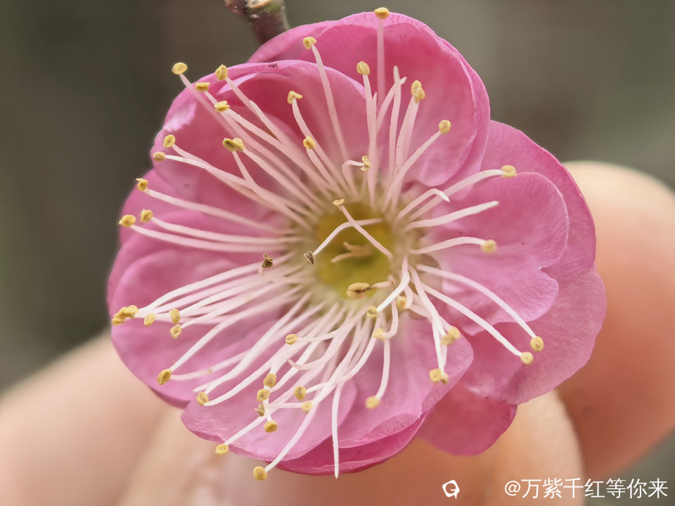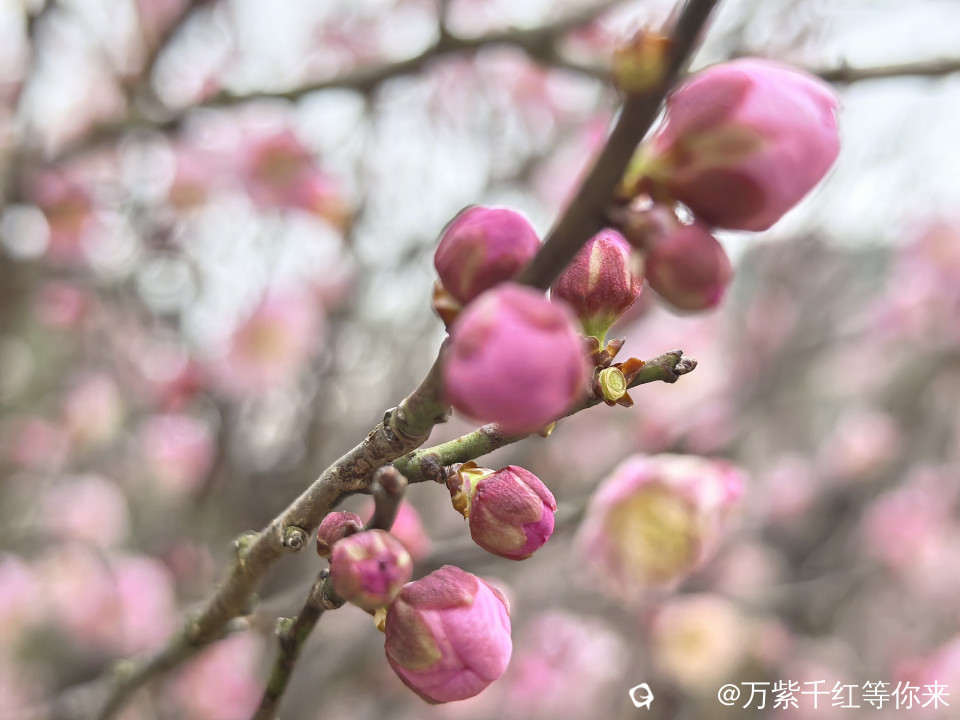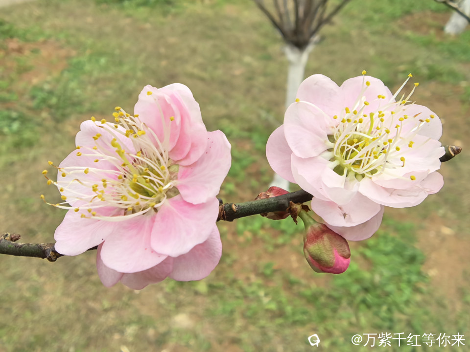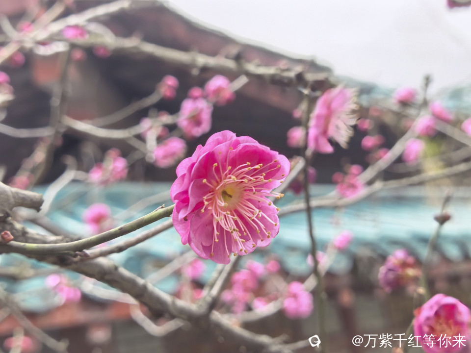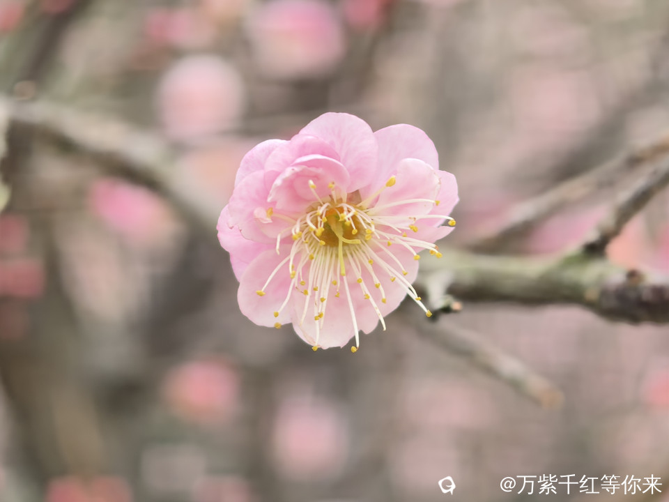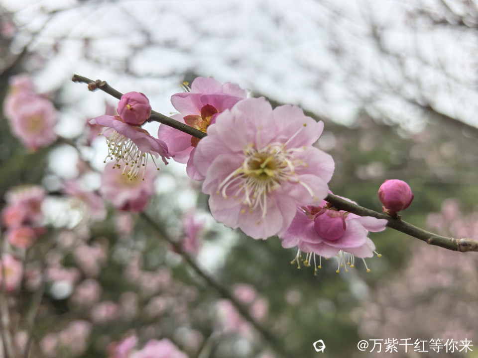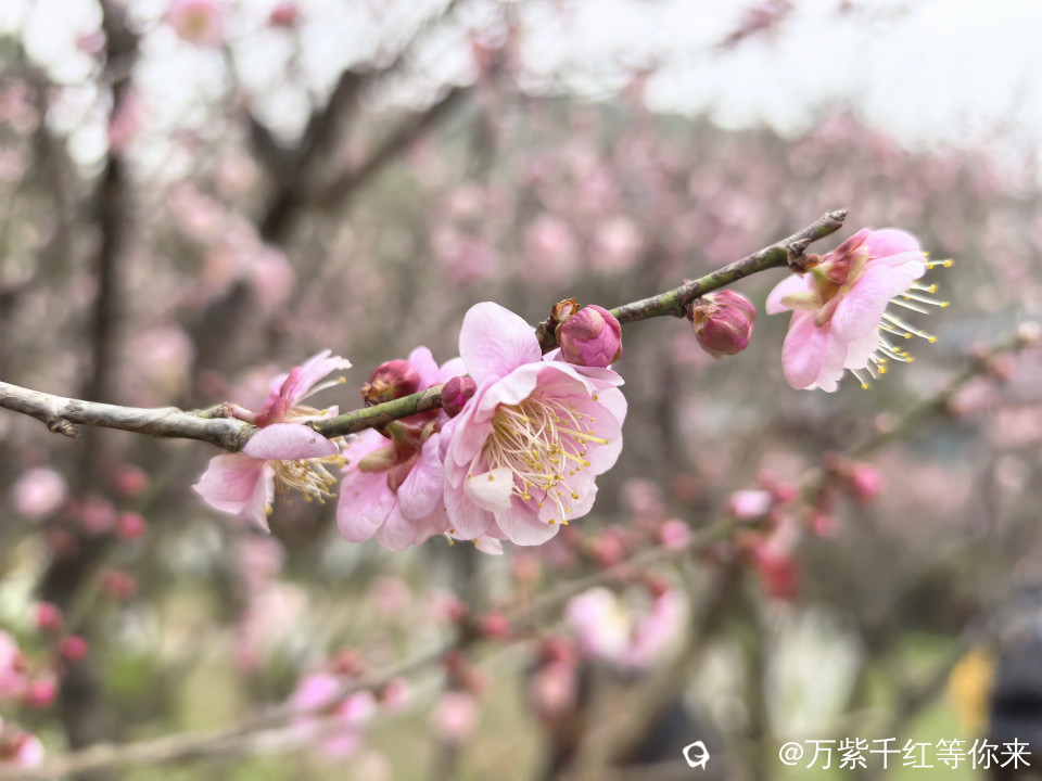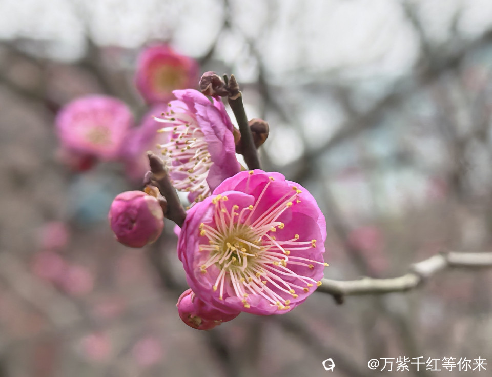 今天走进西山公园晓苑,一缕清冽的暗香就顺着风扑面而来;一株株梅树满枝繁花,有粉色的、桃红色的缀满枝头,花瓣中金黄色的花蕊引得蜜蜂流连。