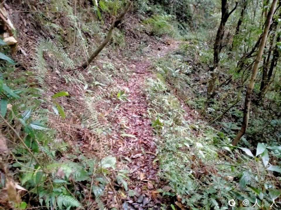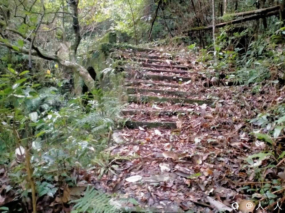 上行一百米后小路被巨石隔断,往右走一个一百米的S形,接上了这条旧时三门往来五通的“大道”。