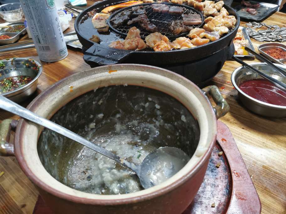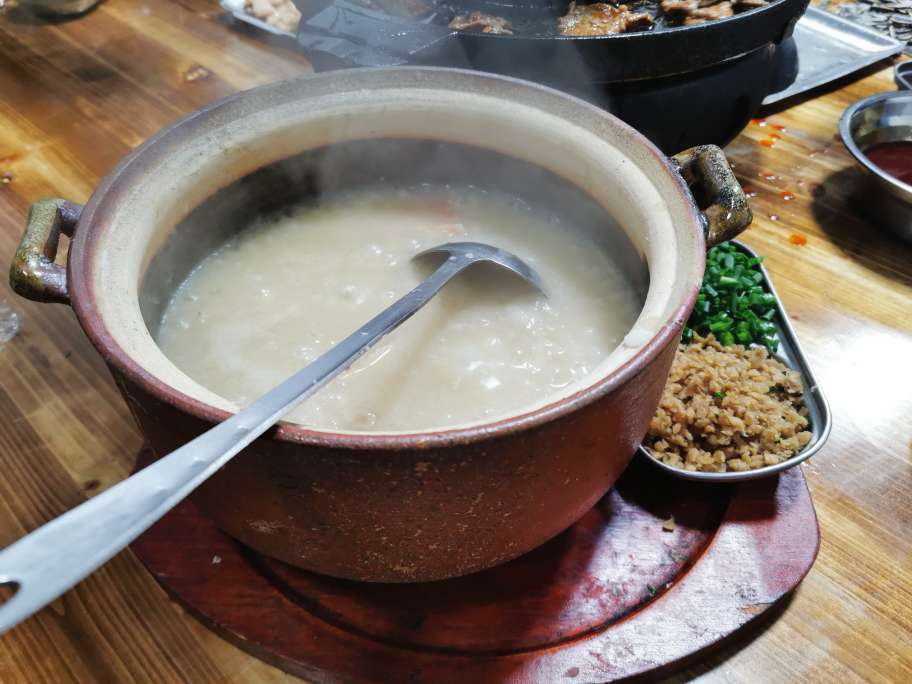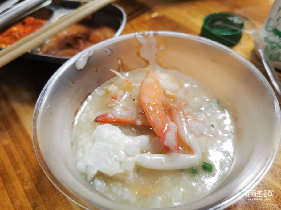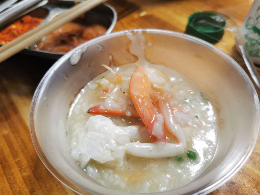 她还叫了一锅海鲜粥,来一碗。