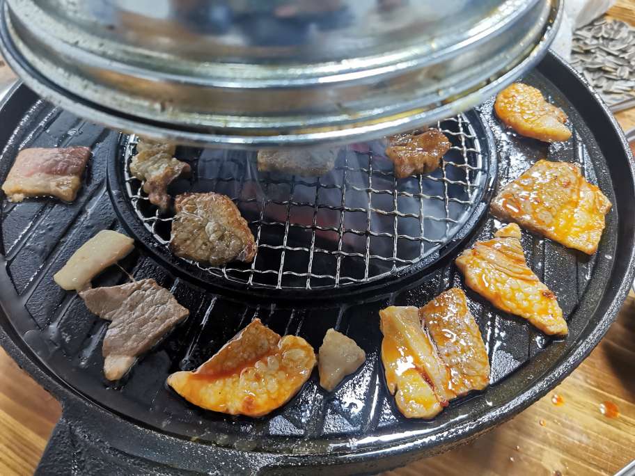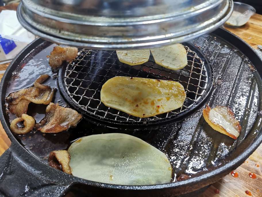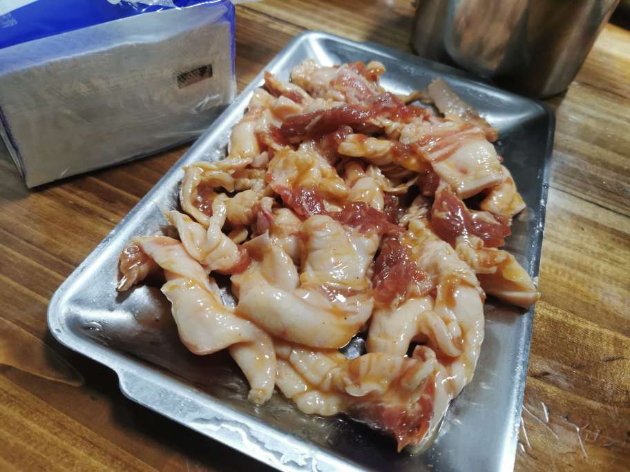 她买了个套餐,各种肉类都有,准备开烤。