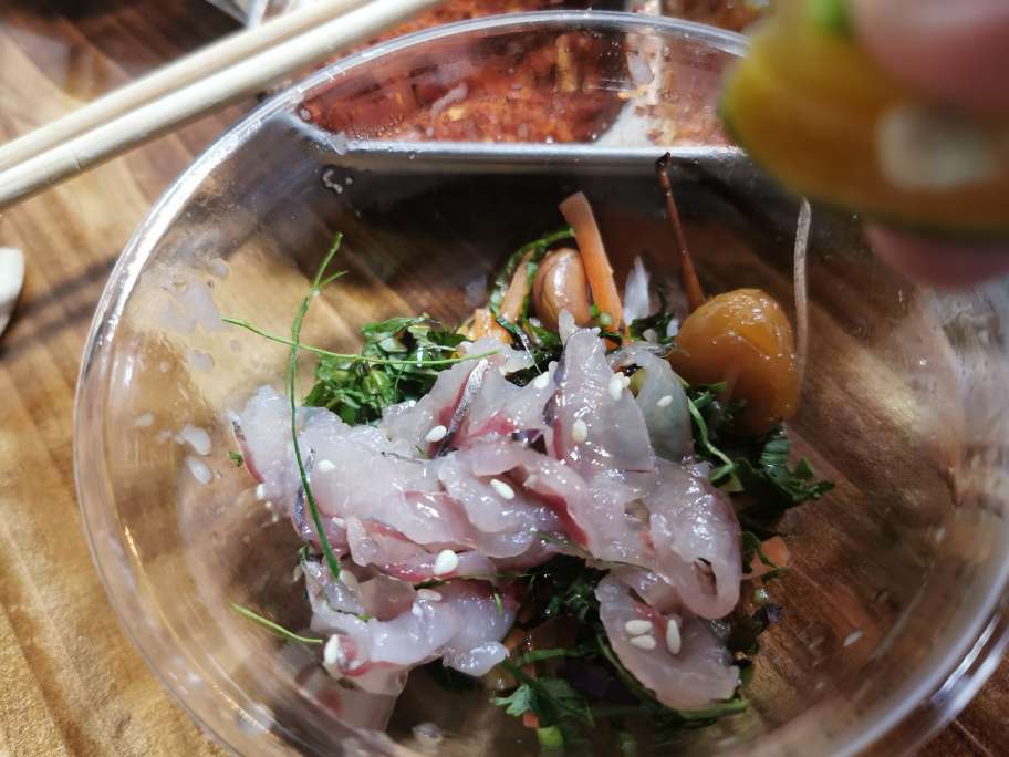 屁股还没坐热就上了重头戏,买来的鱼被加工现场切成了鱼生,这样吃也不错,鼓掌!