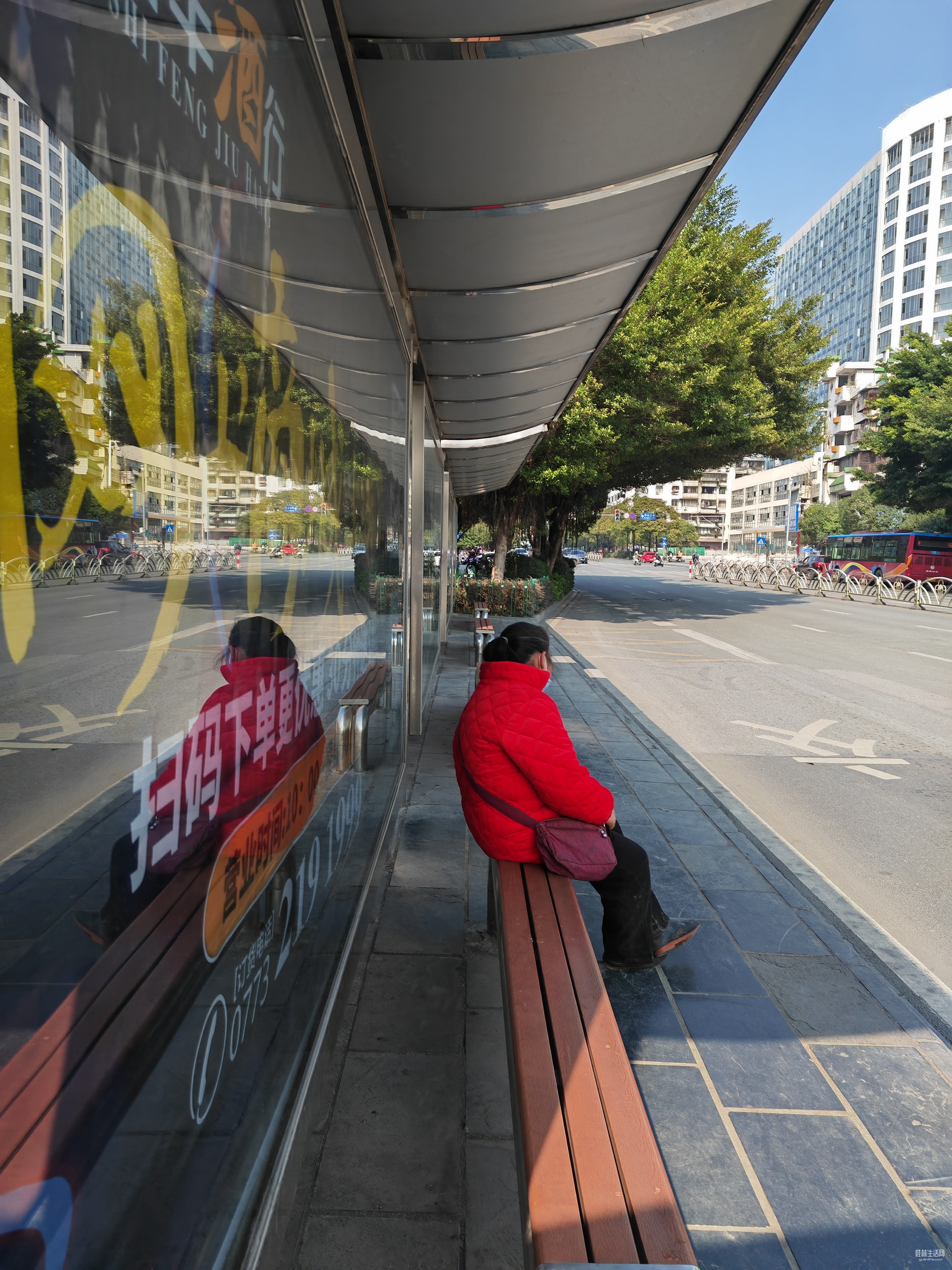 一位身着红色棉衣的女士静静地坐在公交站台的长椅,目光不时投向马路远方。阳光洒落,给整个场景镀上一层柔和的光晕。