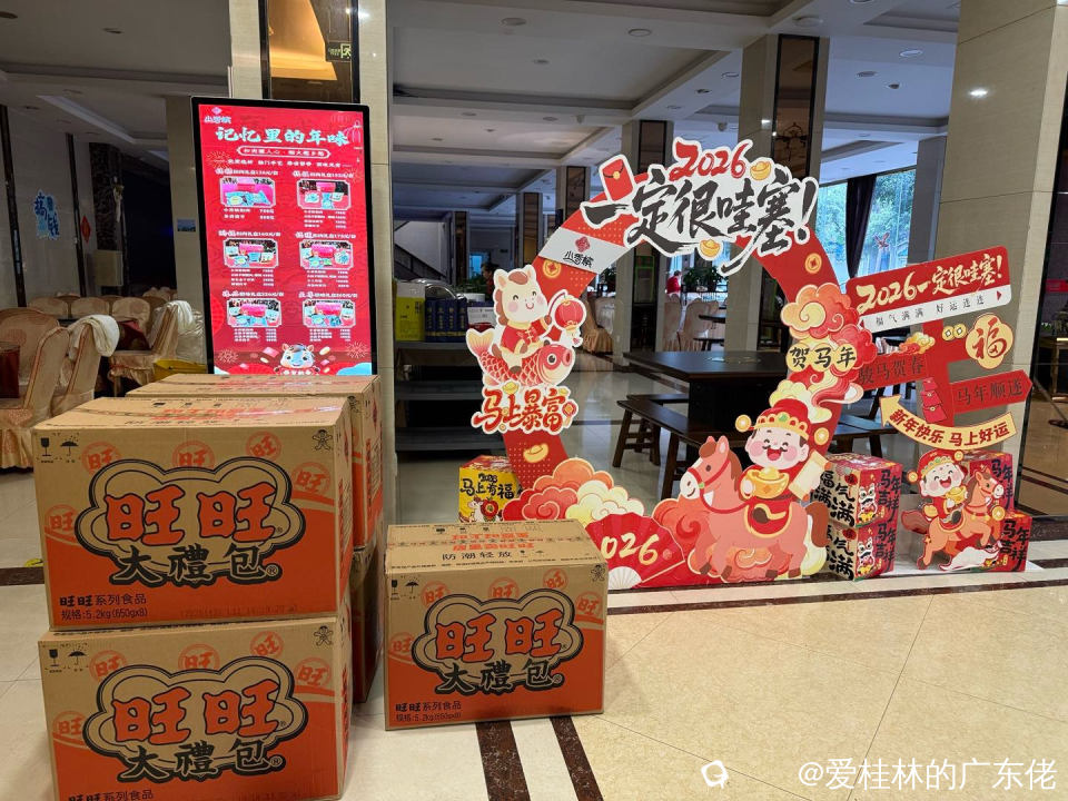 送几件旺旺礼包给饭店,客户摆酒后的伴手礼!见大厅都布置好春节的主题了!