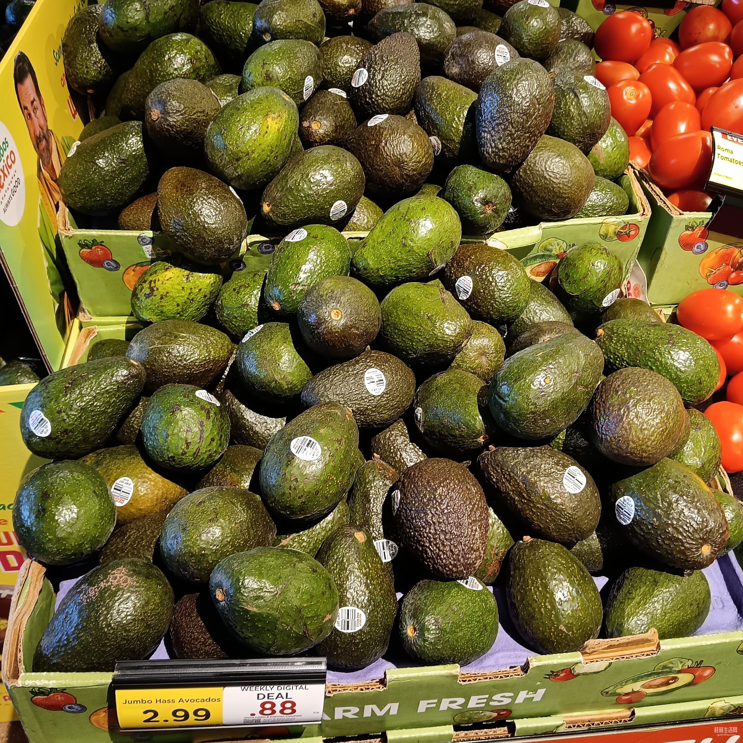 转到水果档,今天牛油果打特价。0.88刀一个。